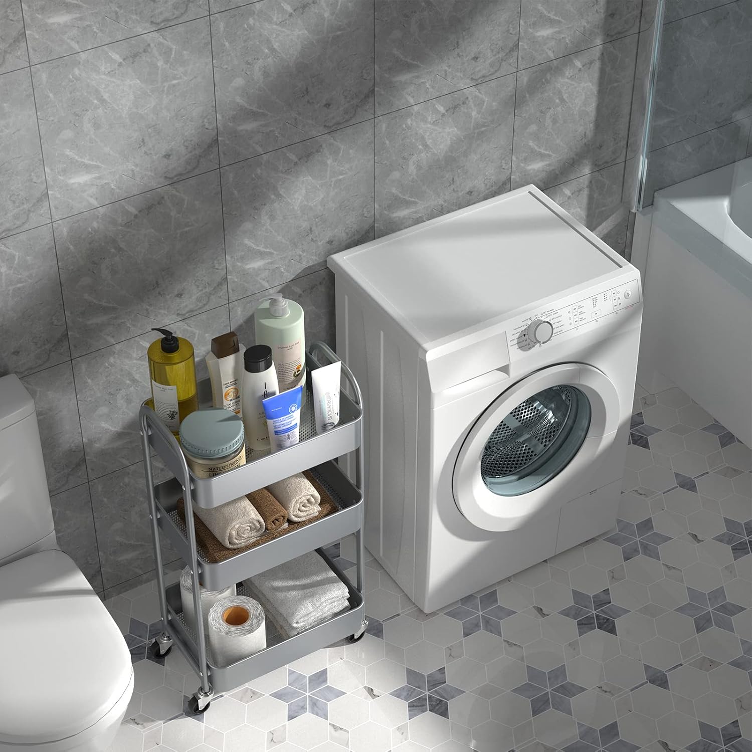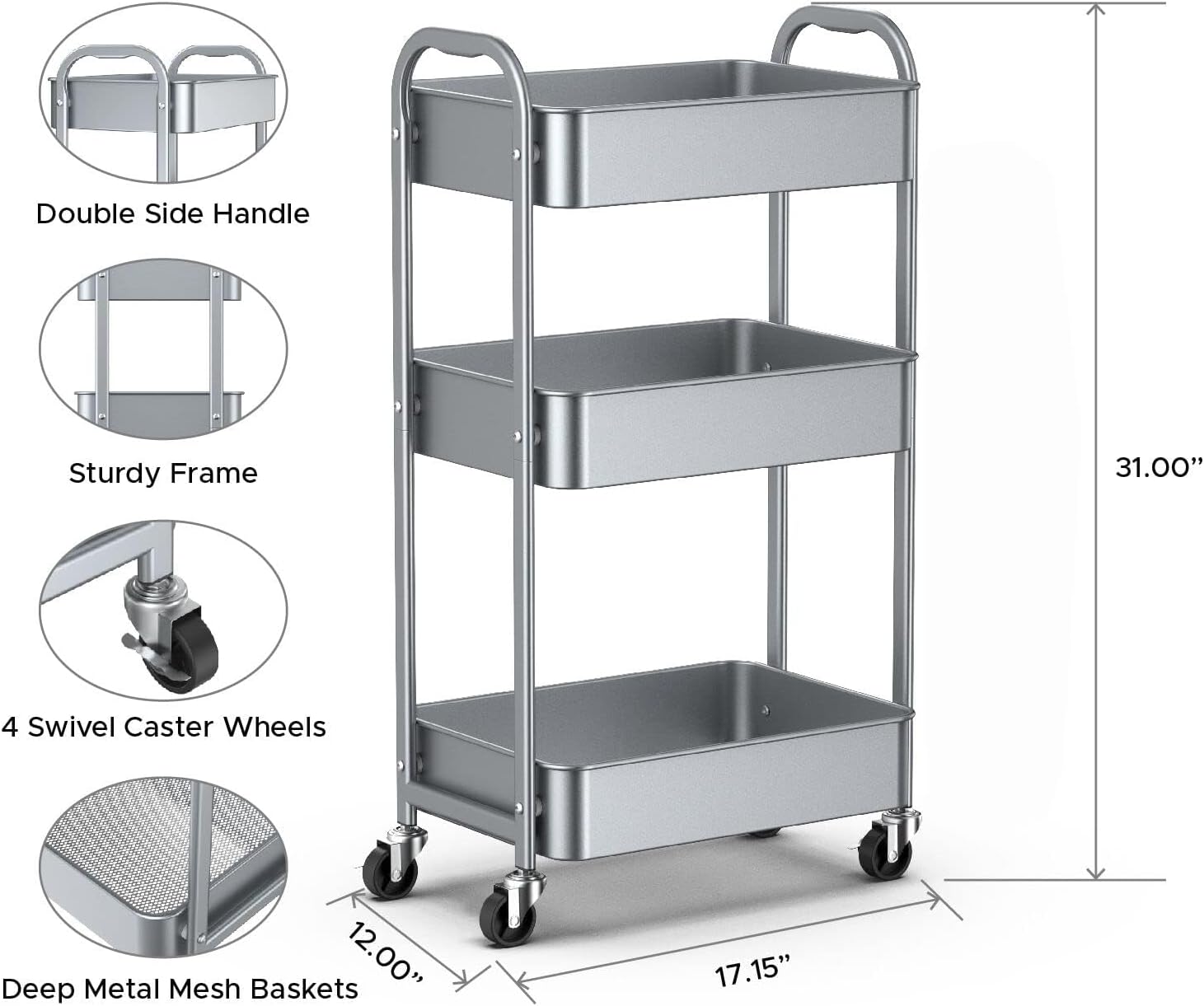 - Perfect Organization:3-tier rolling metal utility or kitchen cart for multifunctional use for storing tools, utensils, supplies, food, beverages, toiletries, and more.