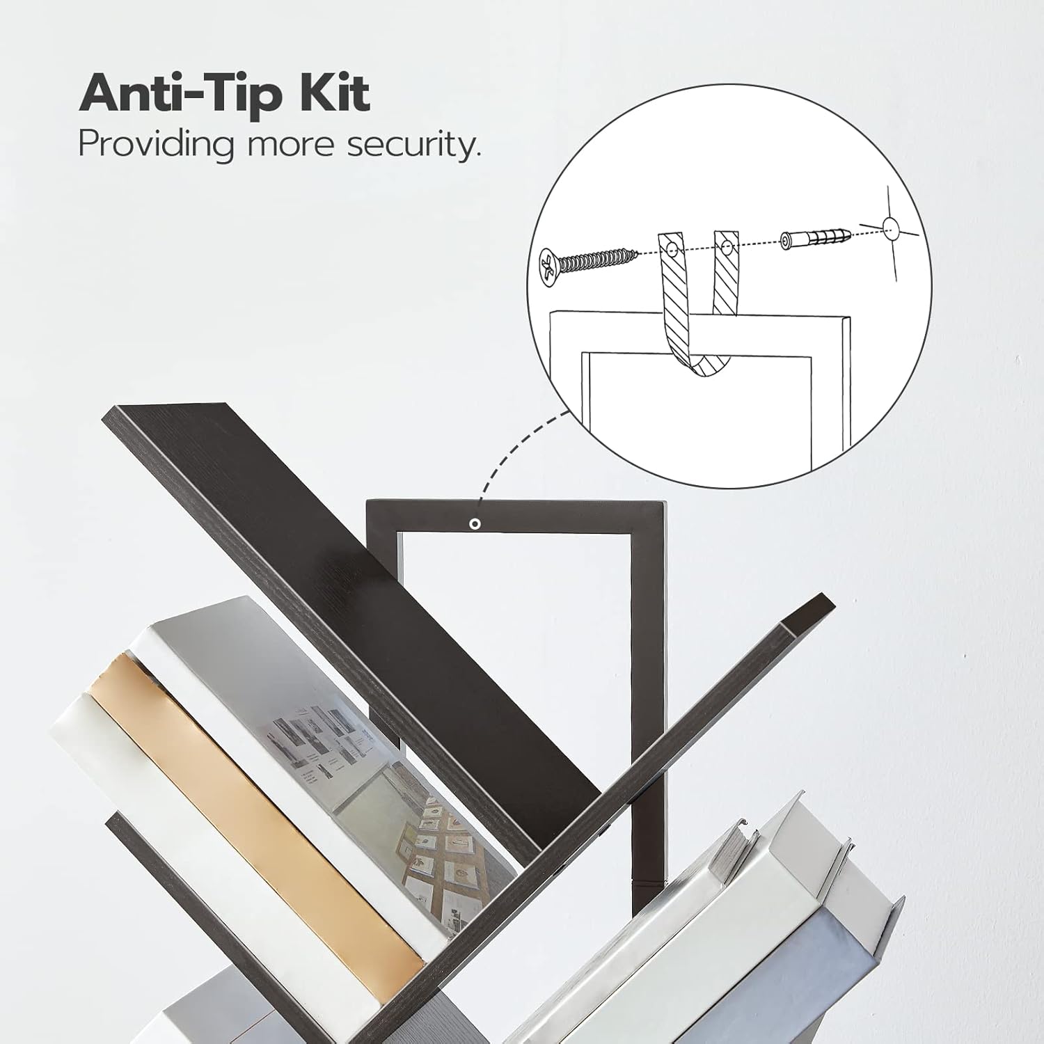 - Stable Structure: The tree bookshelf is made from high-quality particle board and metal frame, which is stable and durable. Equipped with the anti-toppling device, no matter where the book tree bookshelf sits, it can stand safely without worrying about tipping over