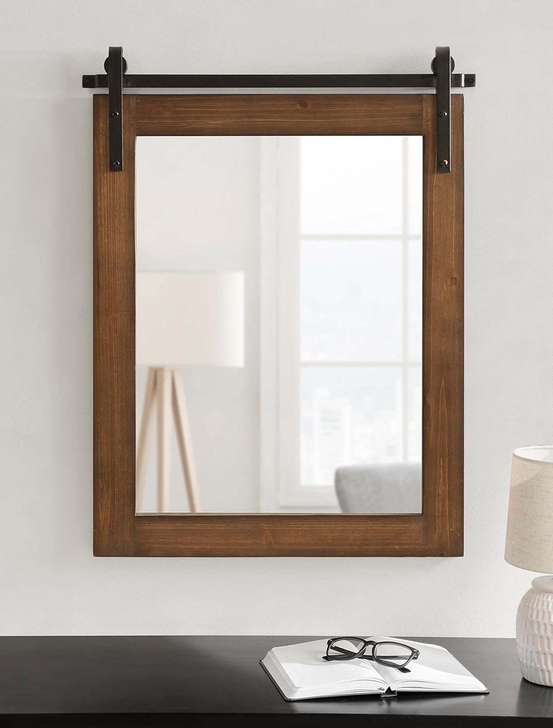 - Modern Farmhouse Mirror: The Cates mirror features a barn door-inspired design with a refined brown finish and black iron bracket inspired by sliding barn doors