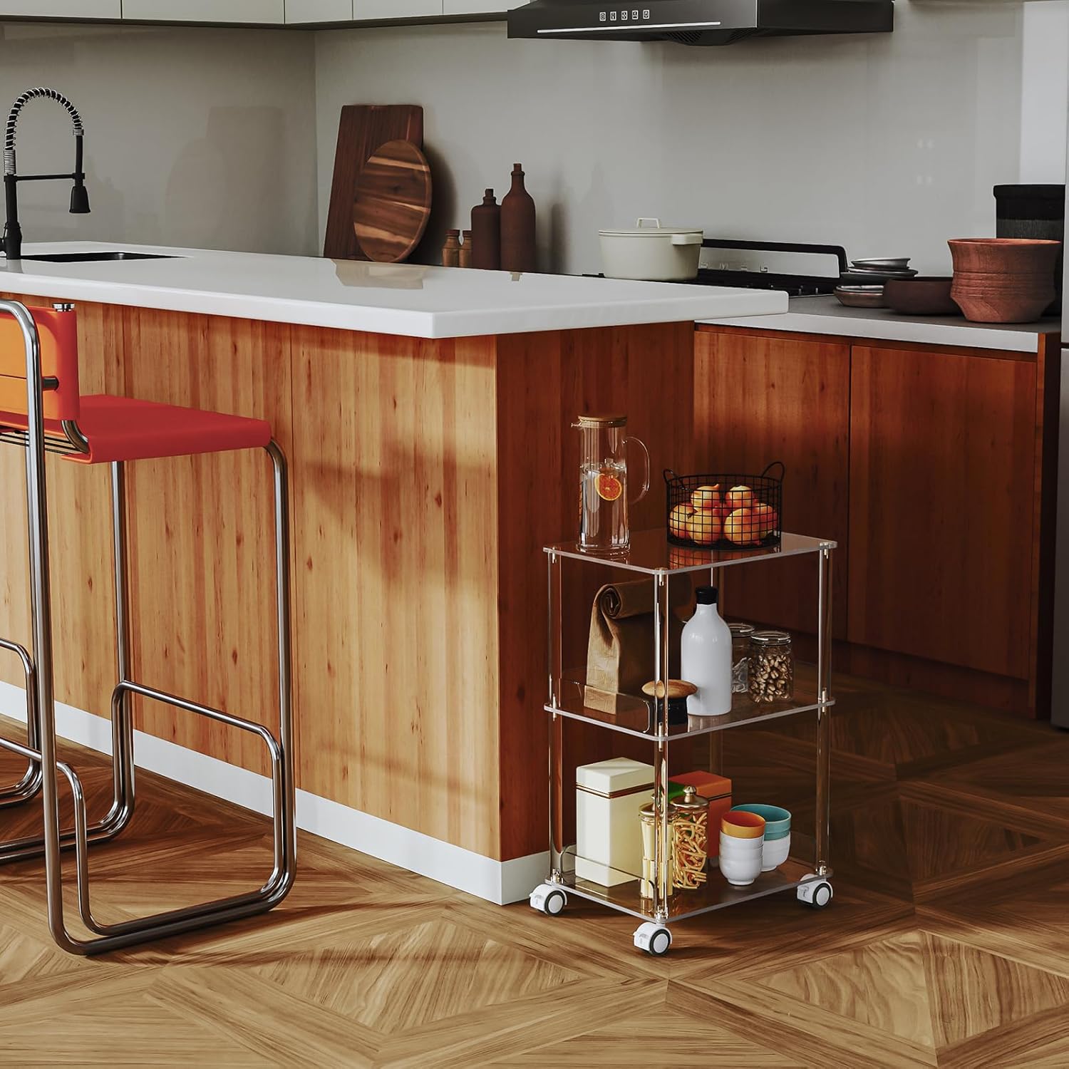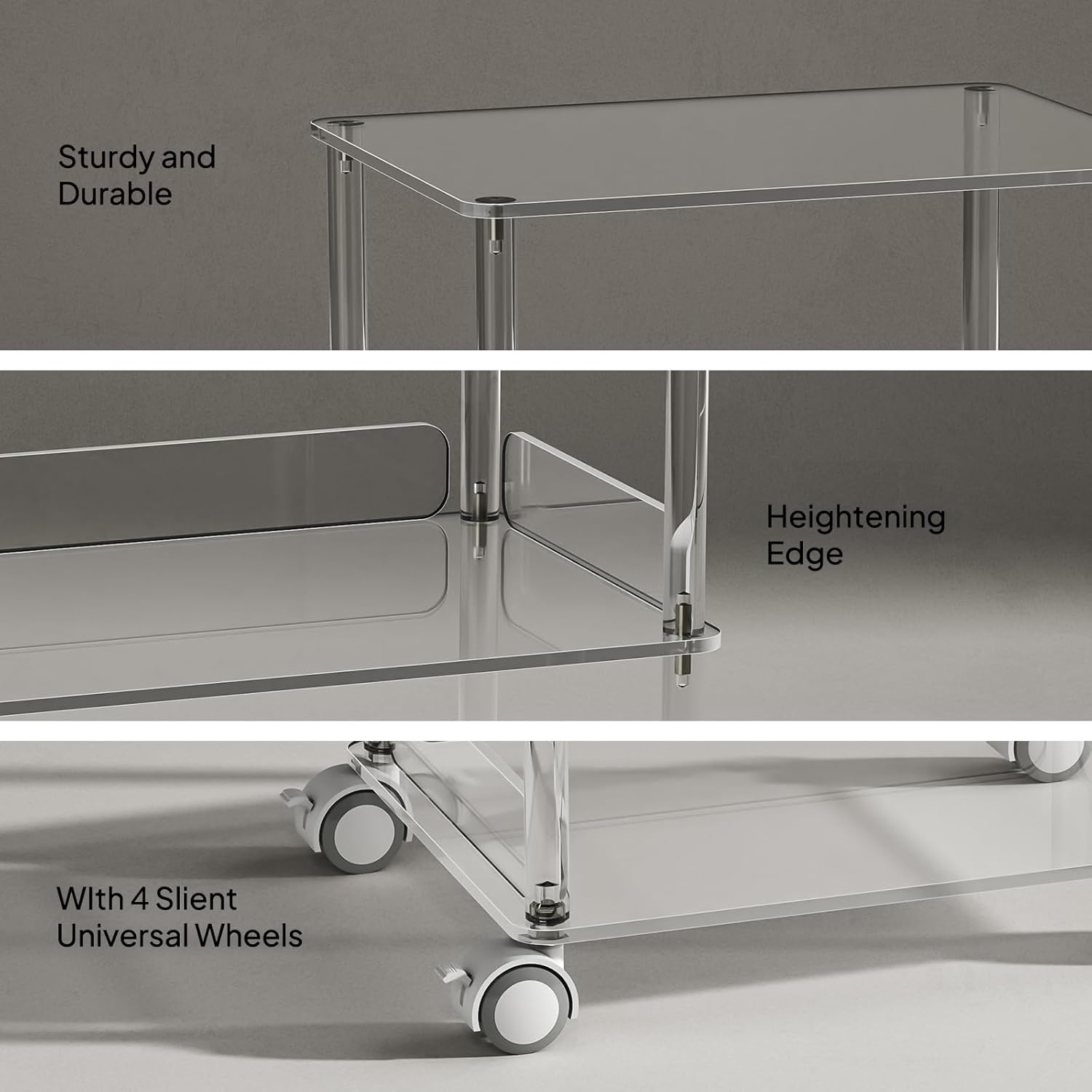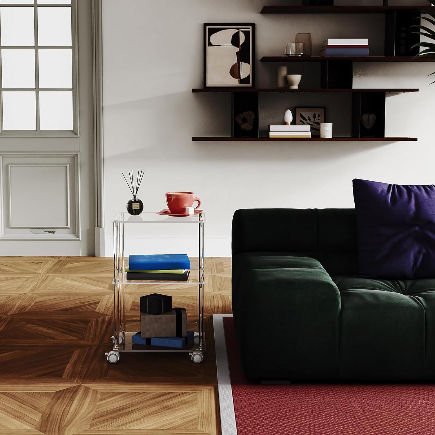 AQUIVER Acrylic Rolling Side Table - 3 Tiers End Table with Lockable Wheels - Small Clear Table for Living Room, Bedroom, Office - 15.6'' L x 11.6'' W x 24'' H
