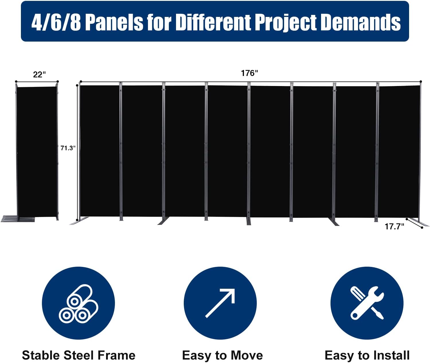 - Portable Moving and Folding Room Divider: Each portable room divider panel is connected by triple buckle hingles, so you can freely adjust the orientation of each panel screen to meet your needs, and connect multiple panels to create large temporary wall. They can also be easily folded up and stored in the garage when not in use. Folding size: 22''L x 71.3''H x 12.6''W, Maximum size: 176''L x 71.3''H x 17.7''