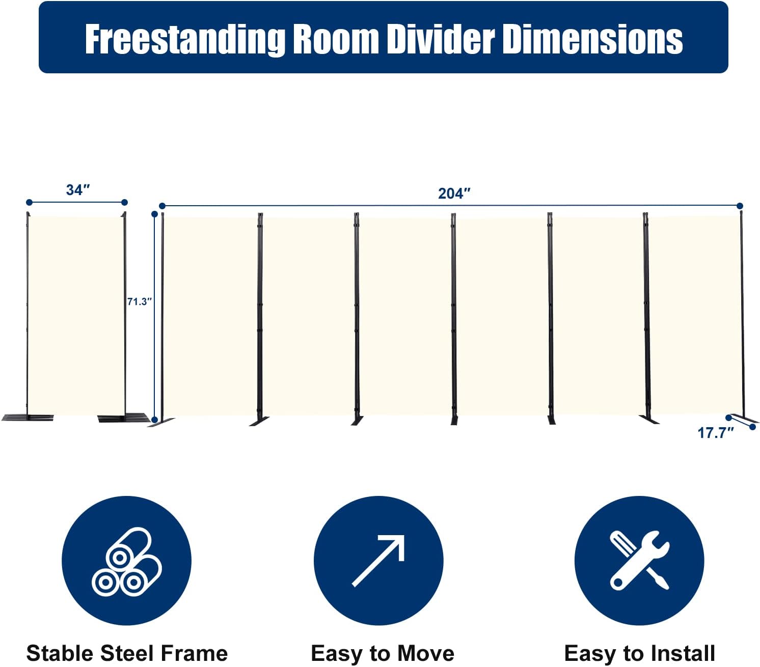 - Portable Moving and Folding Room Divider: Each portable room divider panel is connected by triple buckle hingles, so you can freely adjust the orientation of each panel screen to meet your needs, and connect multiple panels to create large temporary wall. They can also be easily folded up and stored in the garage when not in use. Folding size: 34''L x 71.3''H x 9.45''W, Maximum size: 204''L x 71.3''H x 17.7''