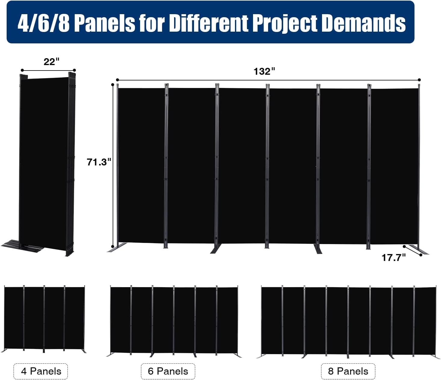 - Portable Moving and Folding Room Divider: Each portable room divider panel is connected by triple buckle hingles, so you can freely adjust the orientation of each panel screen to meet your needs, and connect multiple panels to create large temporary wall. They can also be easily folded up and stored in the garage when not in use. Folding size: 22''L x 71.3''H x 9.45''W, Maximum size: 132''L x 71.3''H x 17.7''
