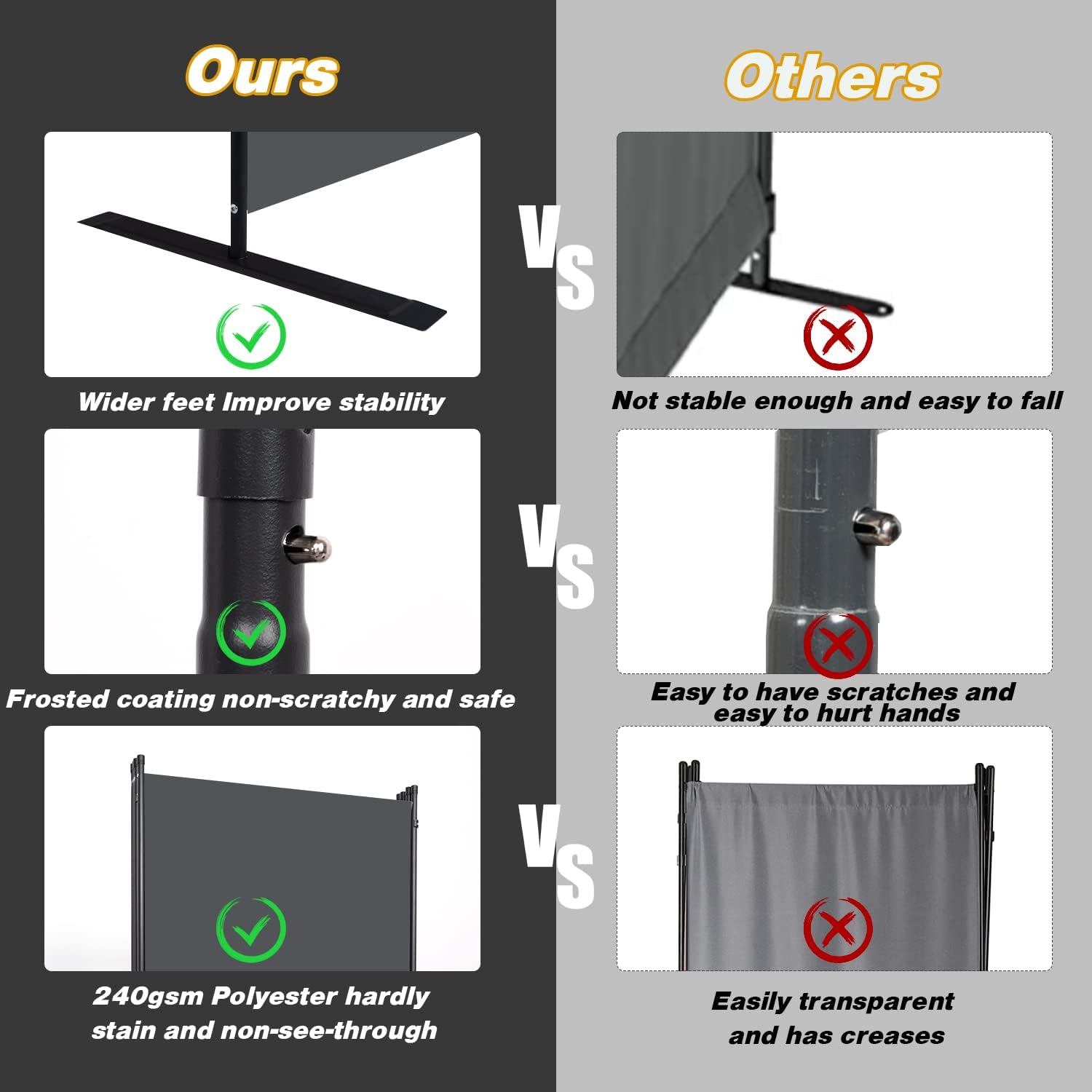 - Upgrades of materials: The panel of partition room dividers are made of watertight, non-see-through and tear-resistant high density 180g polyethylene fabric . The metal frame of the room divider wall is made of strong iron and powder coating, which increases its rust and wear resistance, and also extends his service life. At the same time widened support feet also increase its stability