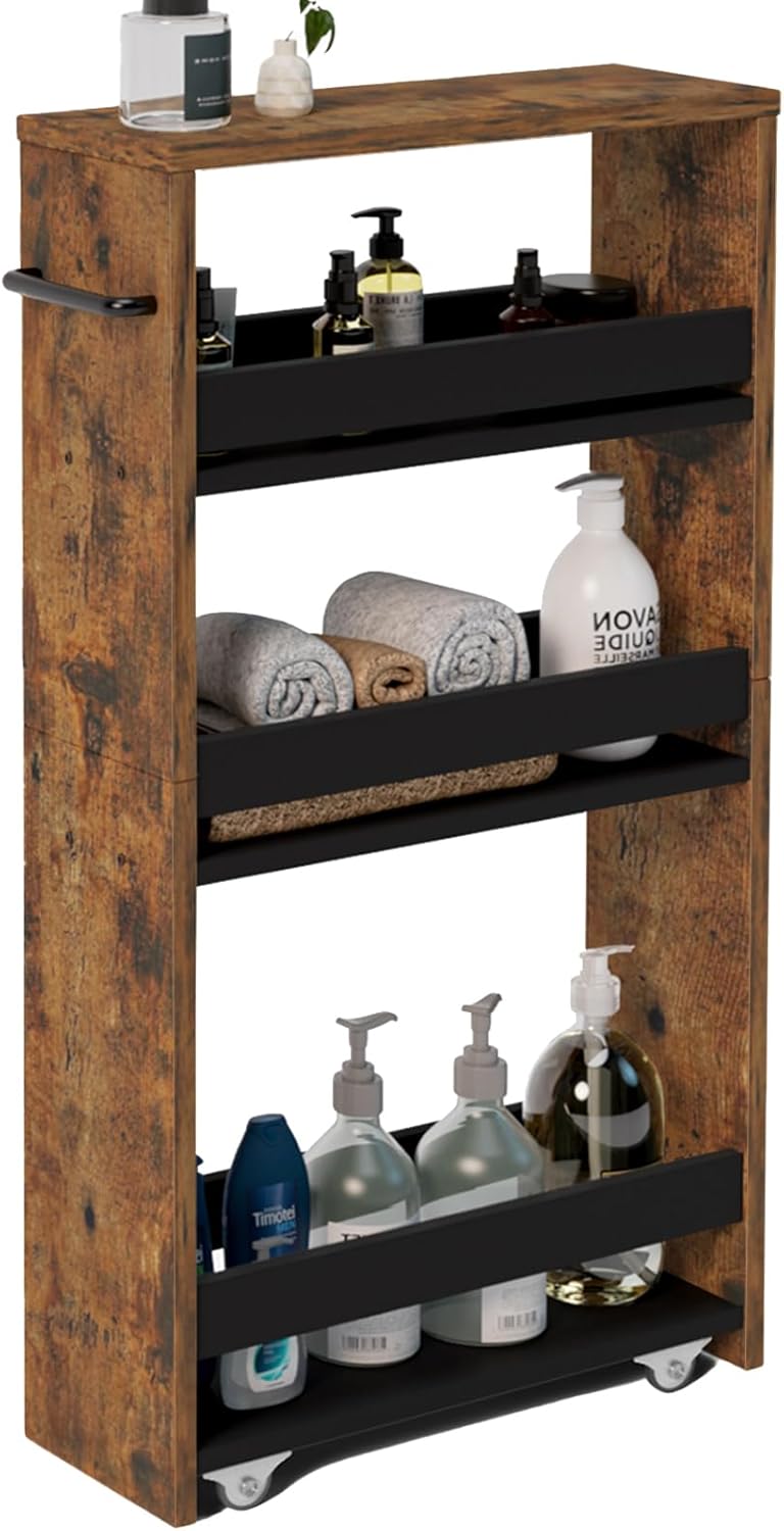- 【Easy to Move】This slim storage rack has 1 handle and 4 wheels, which can be easily pulled out for use when needed and can also be easily pushed in for storage.