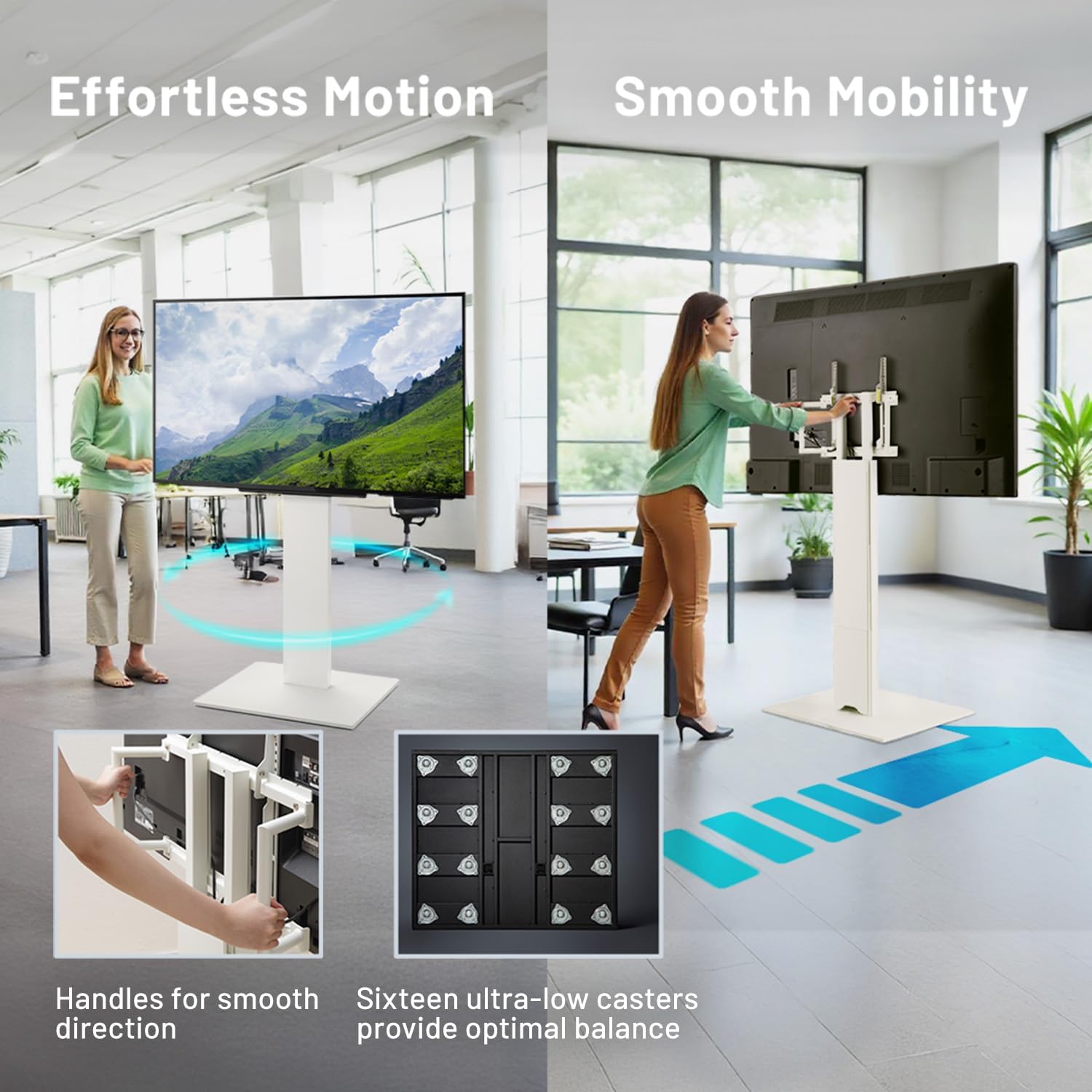 - 【CONCEALED WHEELS】This universal rolling TV stand with wheels features ultra-low floor casters, so it can be moved/used in different rooms. Sixteen nearly invisible caster wheels under the thin, flat base allow for super smooth movement. The back features two handles so the stand can be rotated and moved with ease. *Depending on the material of the floor surface, caster marks and or scratches may remain during movement.