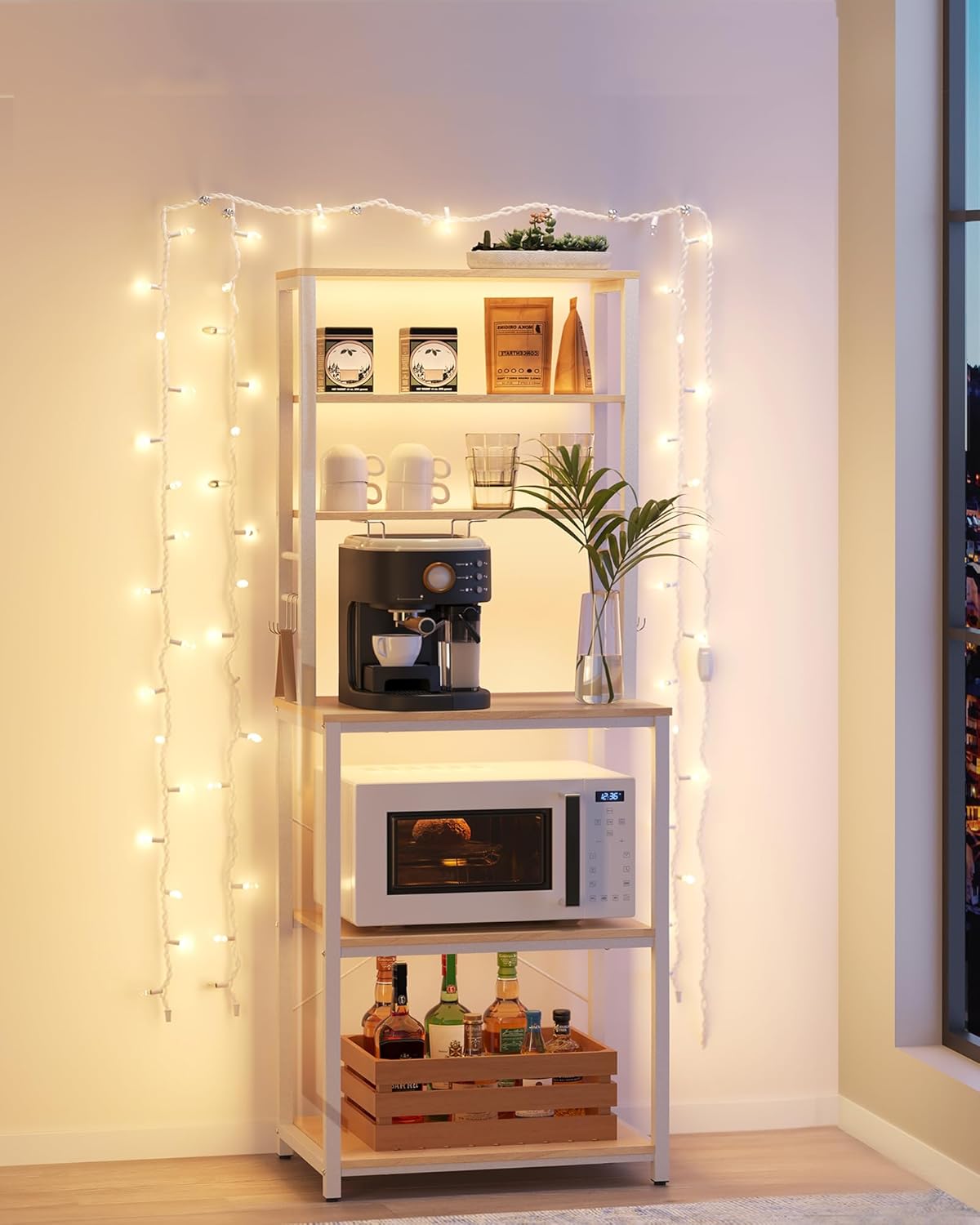 - [Storage for All] Free up your counter space with this baker’s rack that boasts tons of storage—3 upper shelves for bottles, 3 large lower shelves for kitchen appliances, and 6 S-hooks for cooking tools. This all-in-one rack streamlines your kitchen!