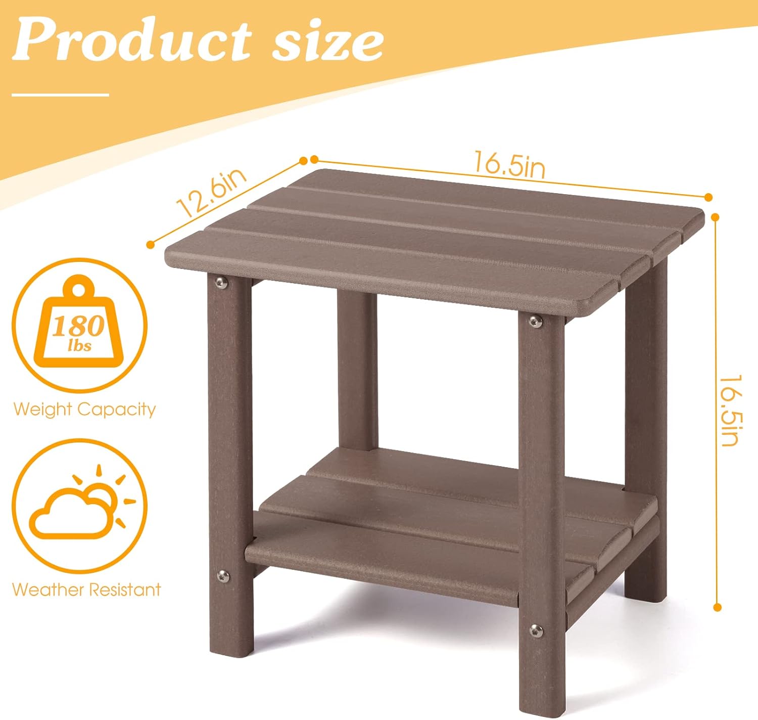 - PRODUCT DIMENSION: 16.5" x 12.6" x 16.5", Outdoor Side Table is free of burrs to prevent stabbing of the skin. And the exquisite connection between panels is firmly fixed by the screws to ensure that it won’t easily wobble or fall apart. outdoor side table is the perfect companion for adirondack chair, chaise lounge and rocking chair.