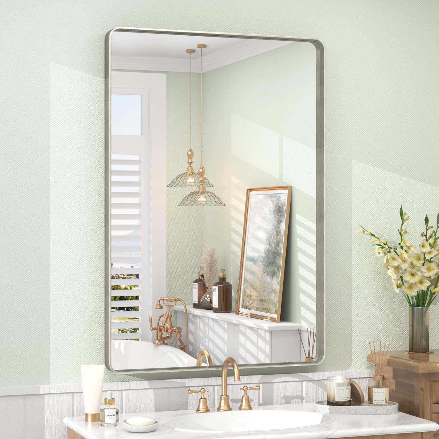 - Durable Silver Brushed Frame: VANLIO brushed nickel bathroom vanity mirror is made of premium brushed aluminum alloy frame, which is rust-proof, corrosion-resistant, and waterproof. More durable and sturdy, and non-deformed. With brushed texture and rounded corners, our Silver framed bathroom mirror looks very elegant and unique with modern and industry style, widely using in bathroom, vanity, farmhouse, bedroom, living room, dining room, entryway, fireplace.