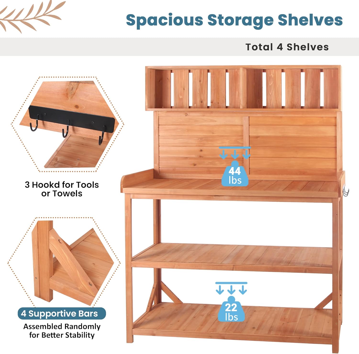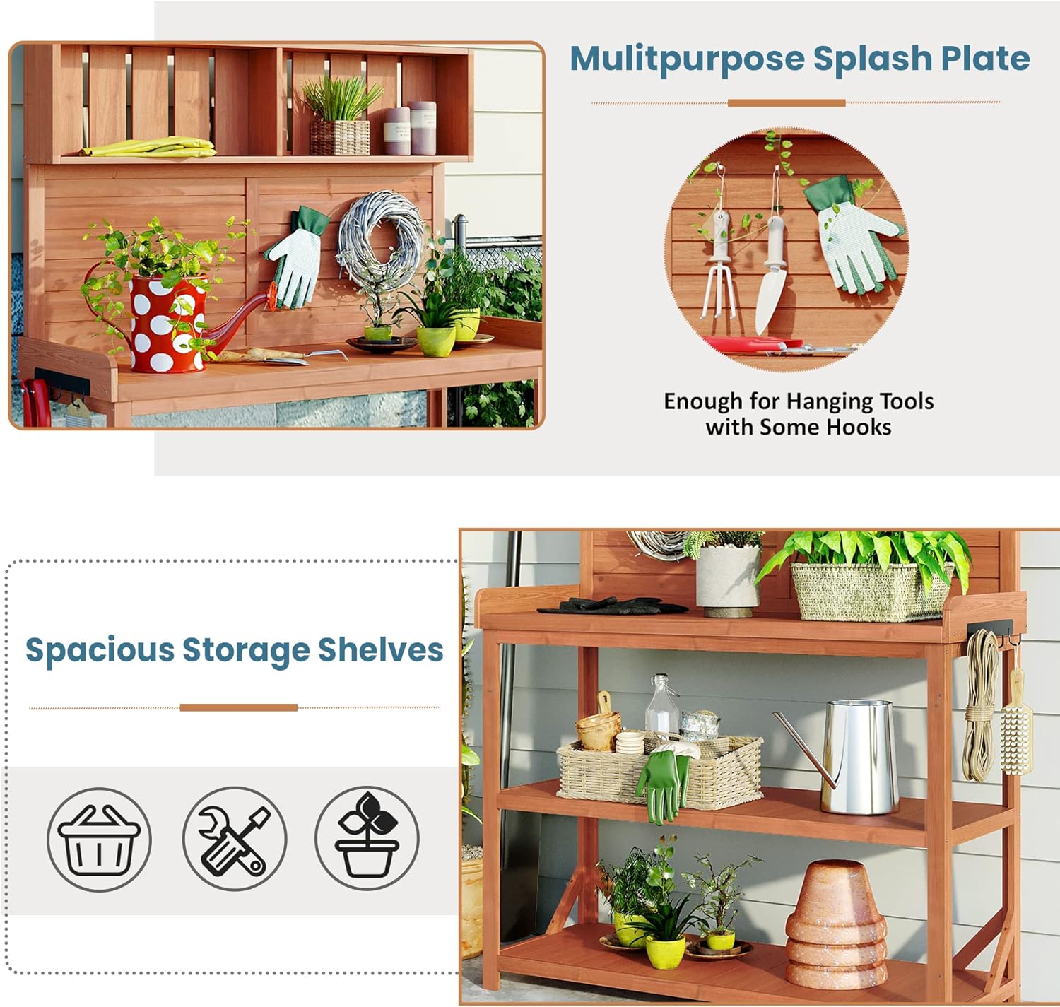 - Splash Plate& Side Hook: There are always many small kits when gardening such as hand trowels, rakes, transplanters, towels, gloves, and, of course, your farmer's hats. Just with some nails, the splash plate will become a board to hold your tools. Besides, the potting table comes with 3 hooks on the side which will make gardening easier.