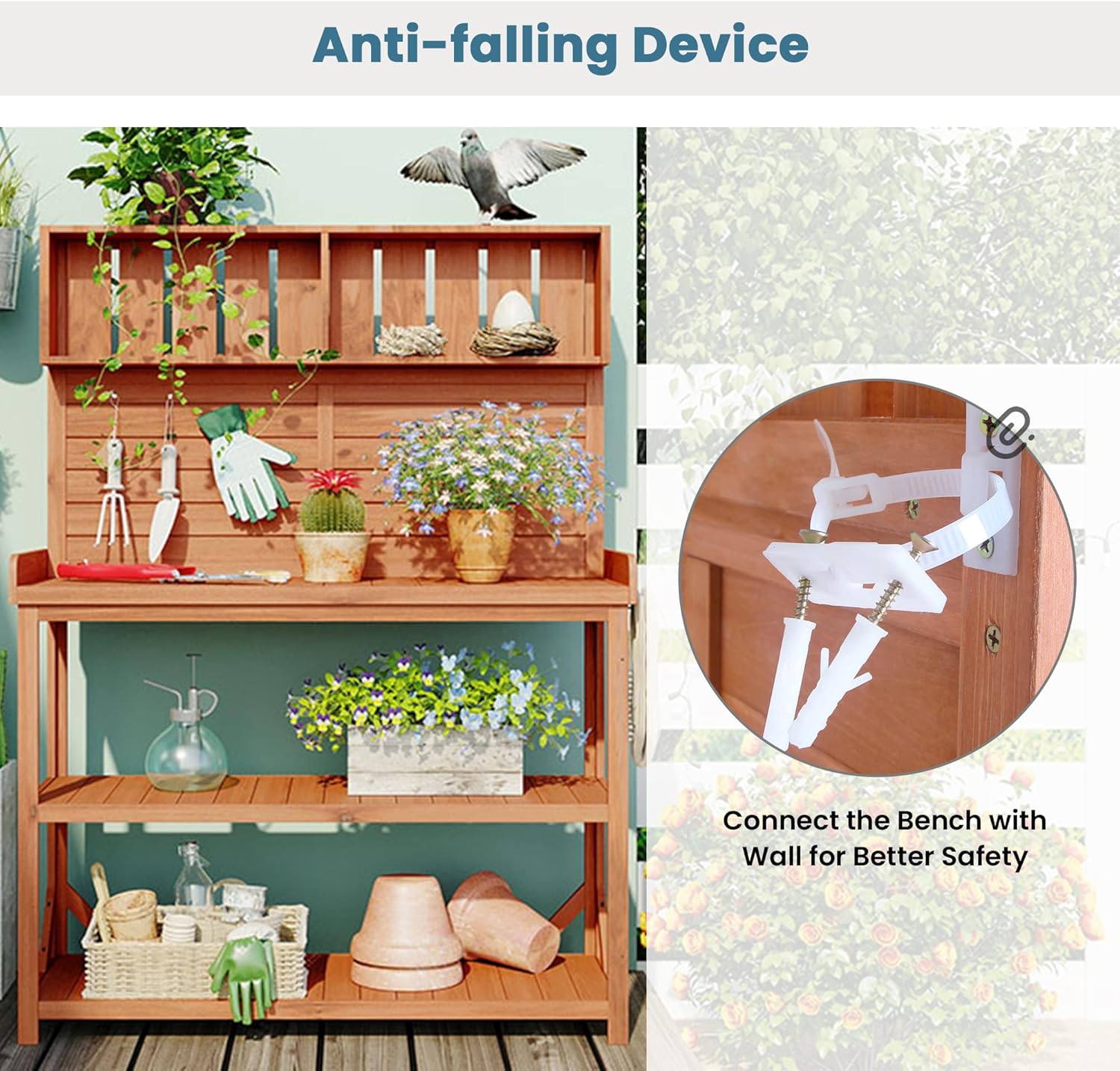 - Anti-Falling Safety Device: There is not always a flat in the garden. For your safety in setting the potting bench, it is designed with an anti-falling device. Just connect the device to a wall for better safety. To strengthen stability, 4 supportive bars are offered to fix in the lower shelves. They can be fixed in any corner until the table is stable.