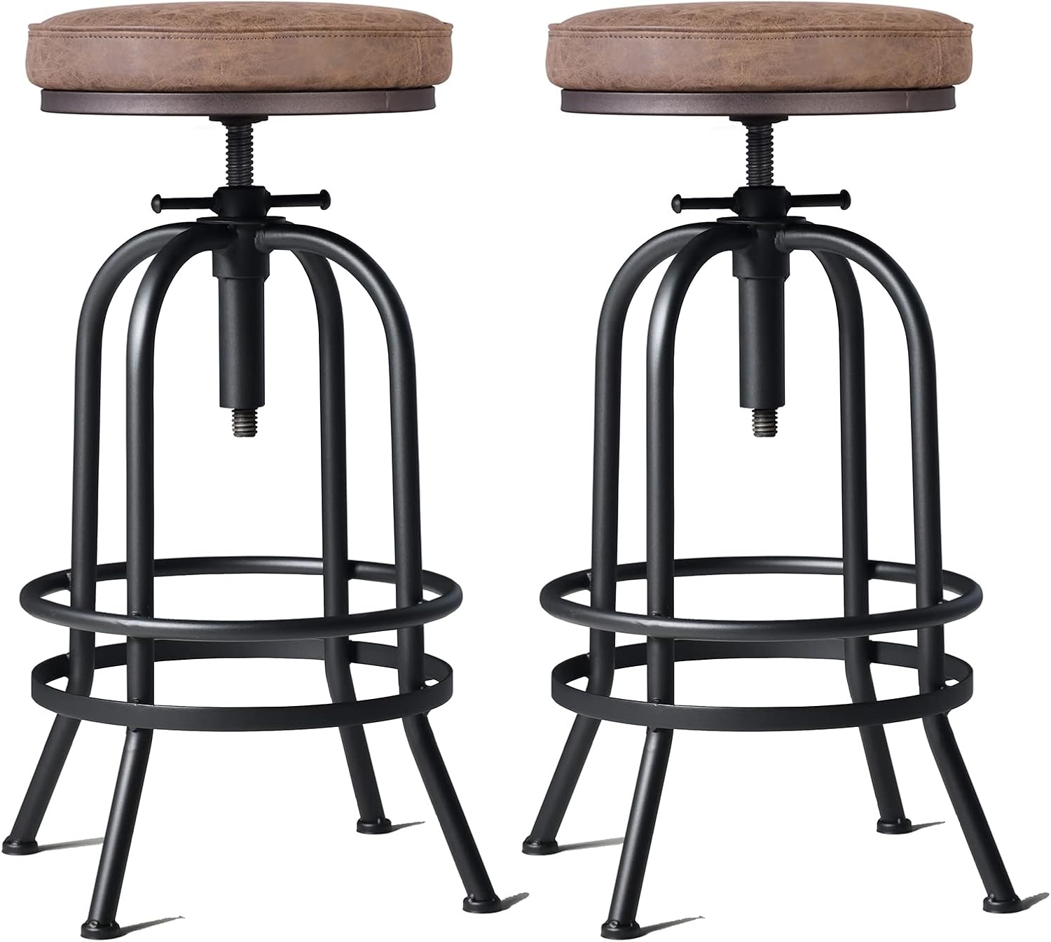 LOKKHAN 32 Inch Vintage Industrial Bar Stool-Swivel Upholstered Metal Bar Height Adjustable Kitchen Counter Breakfast Cafe Stools 2 Pack-Extra Tall 26"-32",PU Leather,Welded