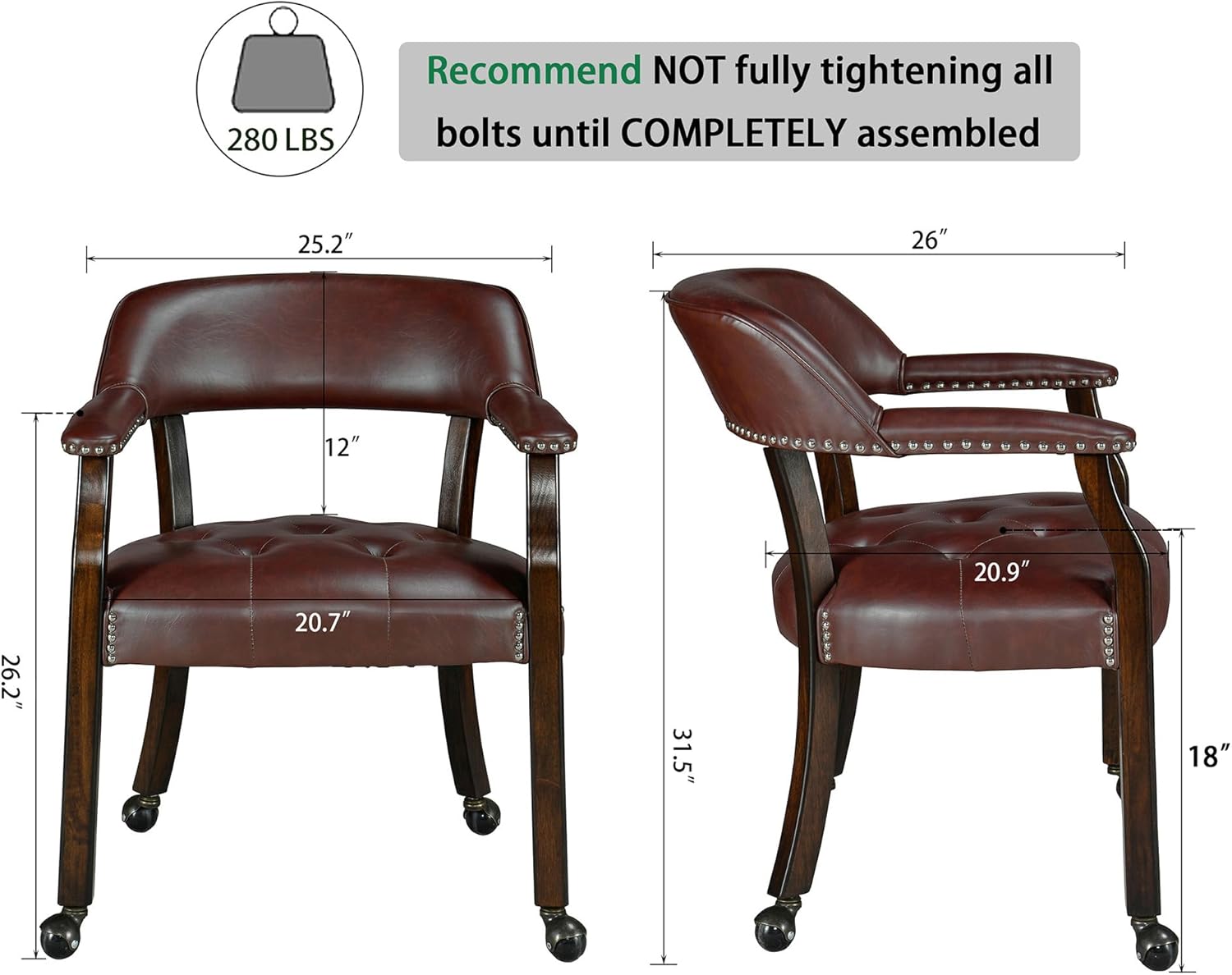 LEEMTORIG Dining Chairs with Casters and Arm, Large Rolling Dining Chairs with Wheel, Poker Table Chairs, Boss Caption's Chairs, 26"D x 25.2"W x 31.5"H, Espresso Legs & Wine Red Brown PU, XXY-1910-WR
