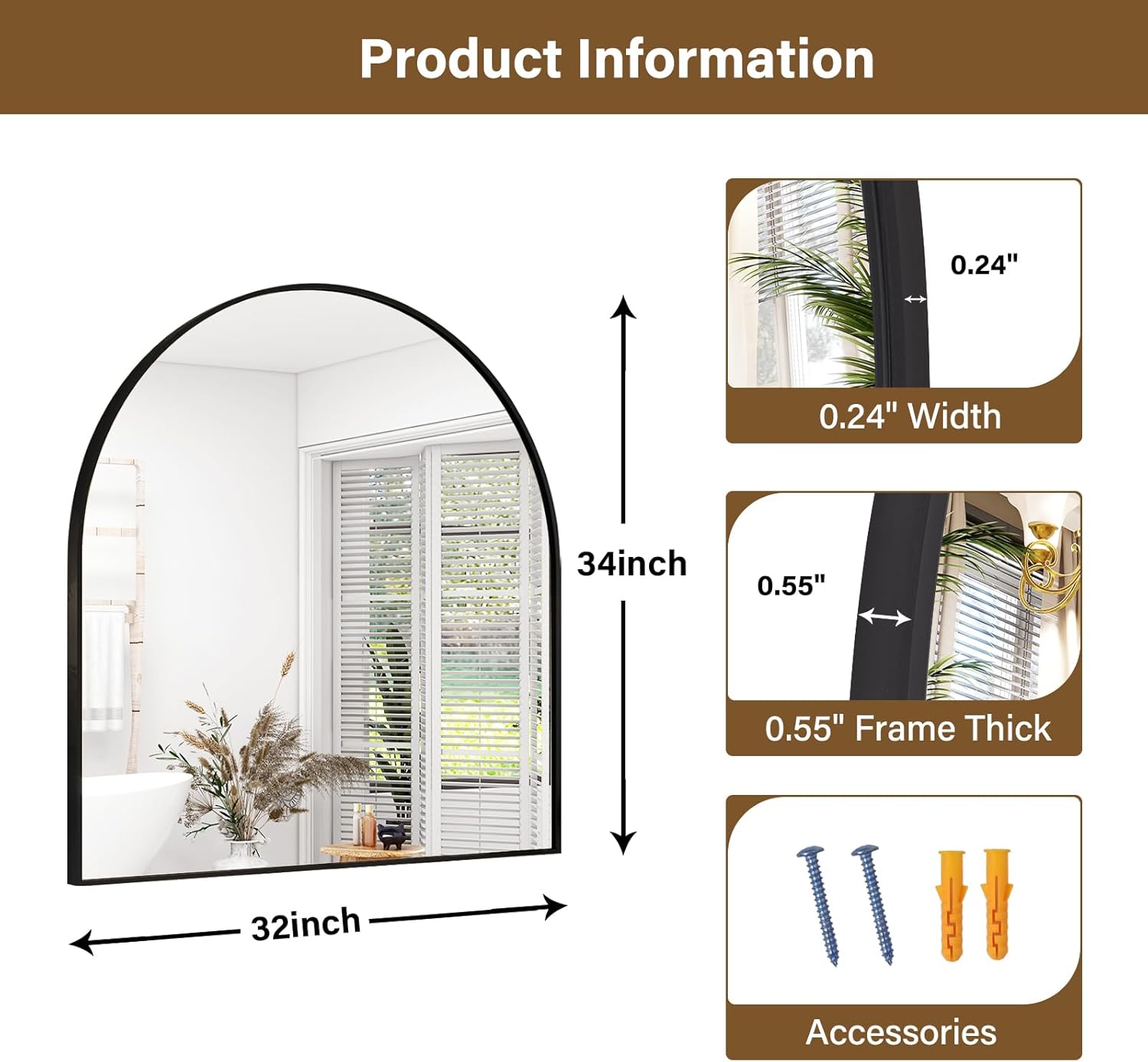 - Multiple Scenes to Match: The arched mirror can be used not only as a makeup mirror, but also as a decorative mirror to add visual effect and space to a room. Its moderate size of 32" x 34" is suitable for bedrooms, living rooms, bathrooms, gallery walls, entrances, salons and even stores