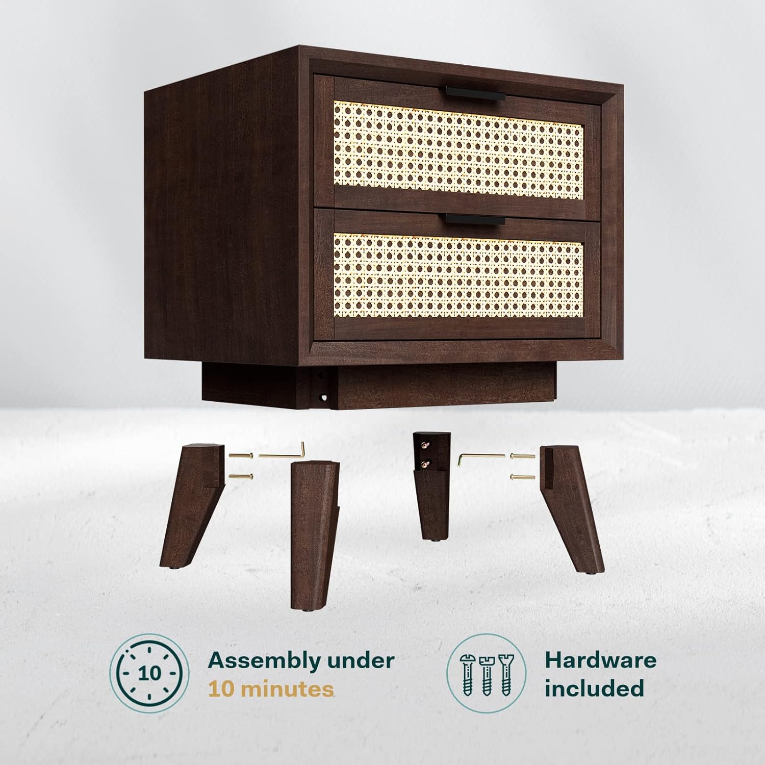 Bme Jasper Deluxe Solid Wood Rattan Nightstand Fully Assembled-Mid Century Modern Side Table with 2 Drawers-Multipurpose use for Living Room, Bedroom-Walnut