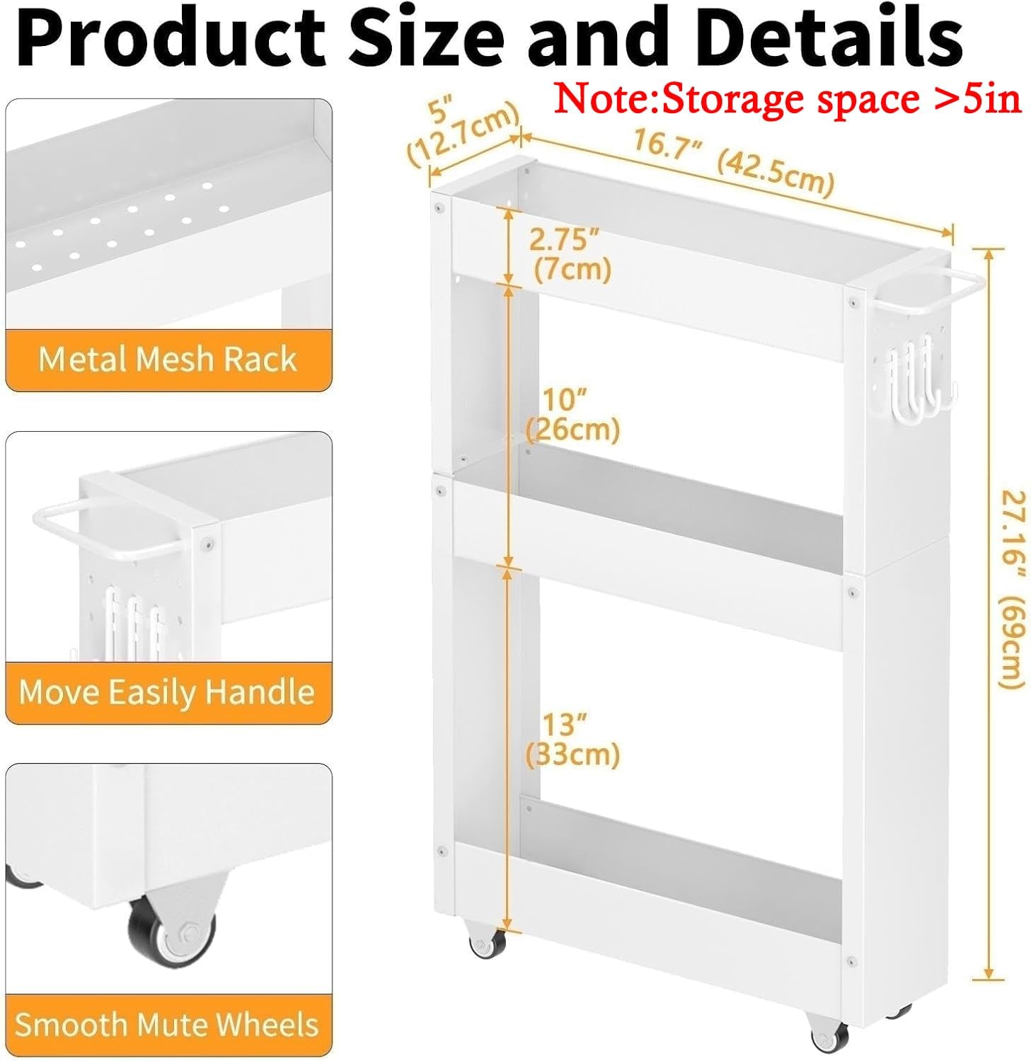 Slim Storage Cart, 5 in Width, 3-Tier White Rolling Cart with Handle for Kitchen Bathroom Laundry Narrow Places