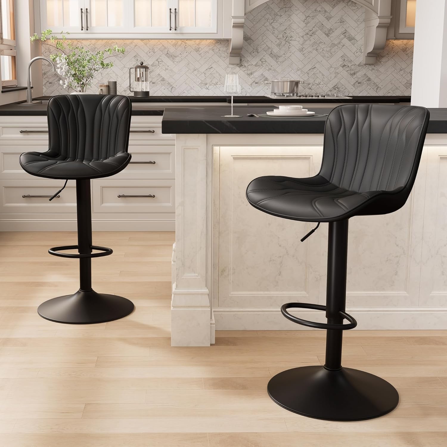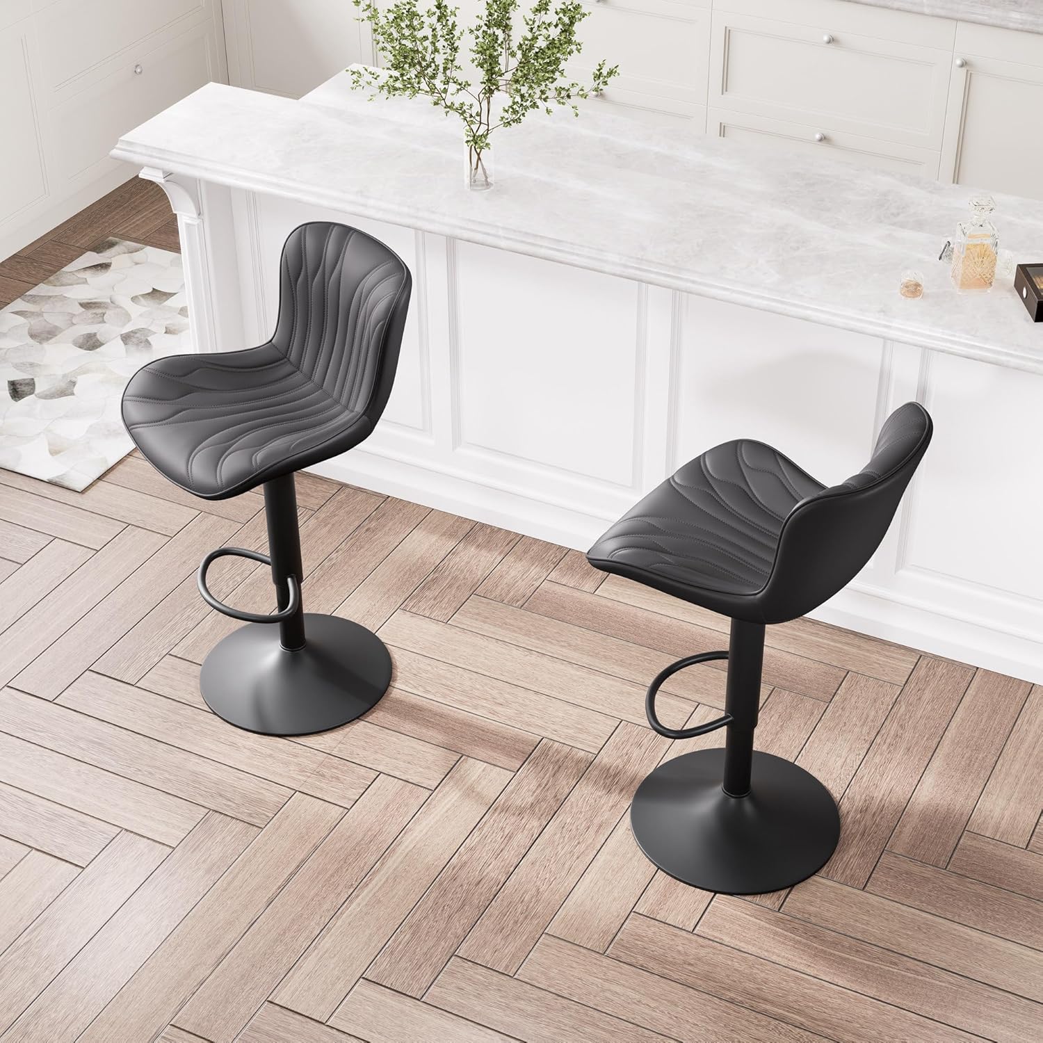 YOUNIKE Black Bar Stools Set of 2 Upholstered Modern Swivel Counter Height Bar Chair with Back Adjustable Kitchen Island Tall Faux Leather Padded Barstools Metal Breakfast