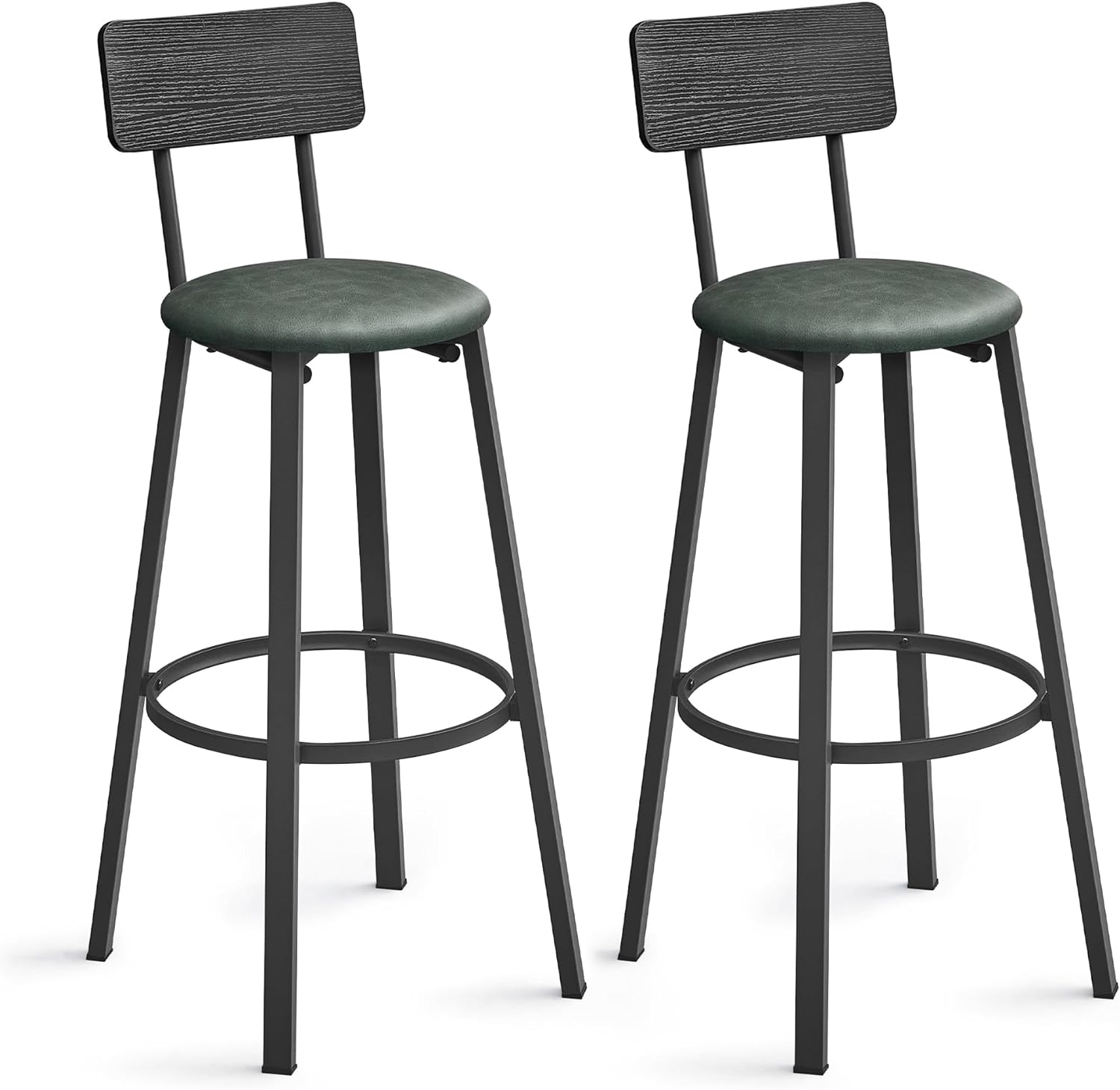 VASAGLE Bar Stools, Set of 2 PU Upholstered Breakfast Stools, 29.7-Inch Barstools with Back and Footrest, Simple Assembly, for Dining Room Kitchen Counter, Classic Black and Forest Green ULBC069C01