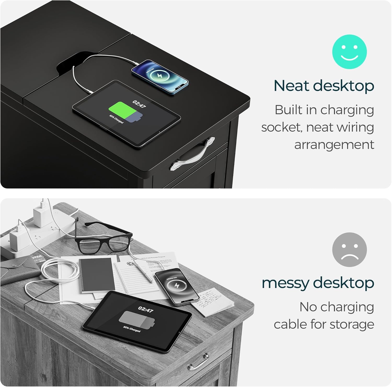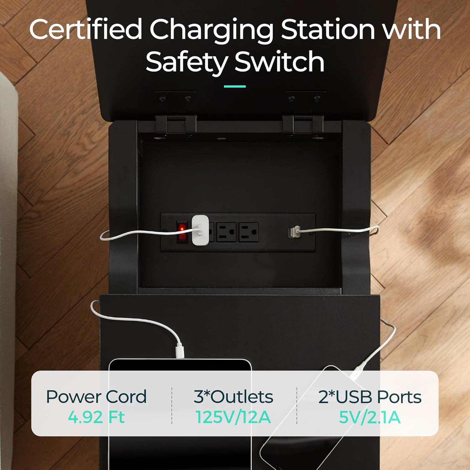 - End Table with Charging Station - Keep your devices charged and organized with this end table, featuring a safety switch, 3 outlets and 2 USB ports. Designed grooves from tabletop for easy use cables and keep desk neater