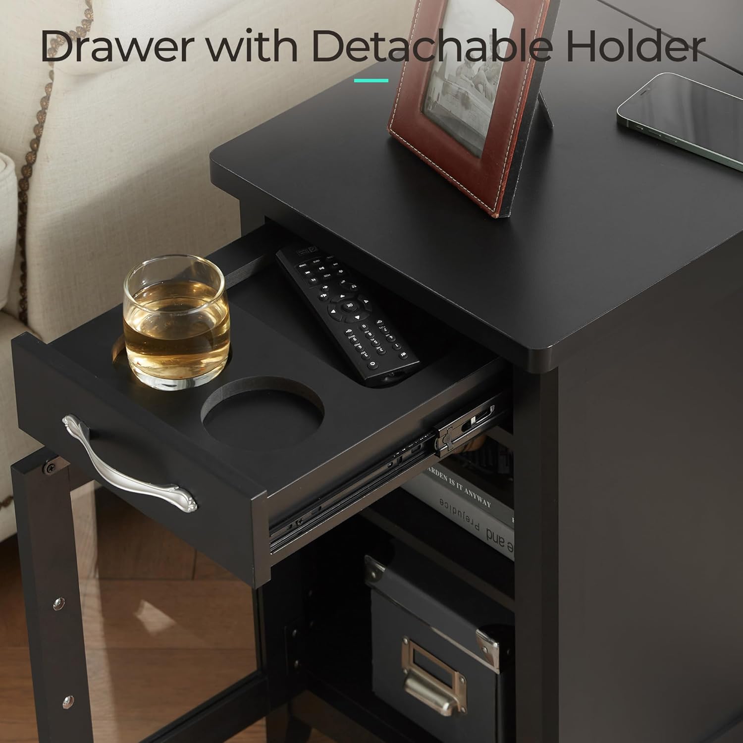 LINSY HOME End Table with Charging Station, Side Table for Bedroom with Drawer and Detachable Holder, Storage Shelf with Glass Door, Extra Storage & Display Space, Small Nightstand for Living Room
