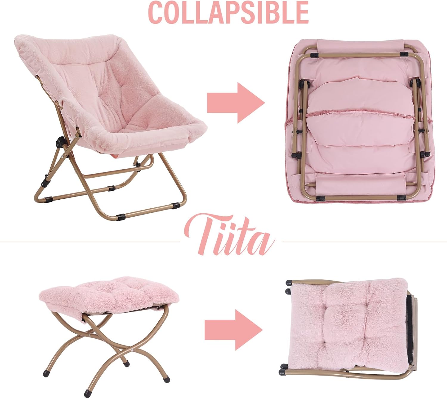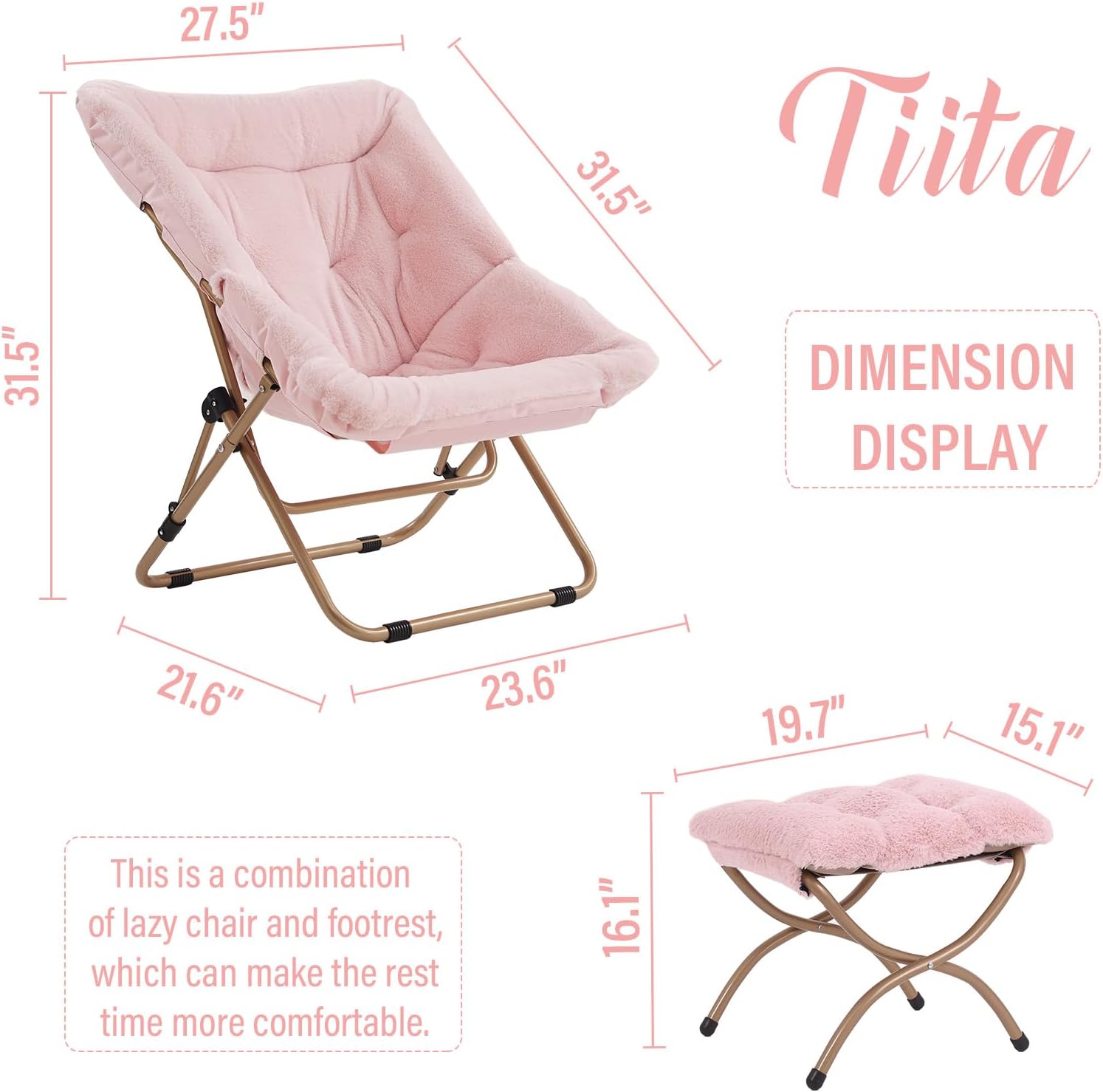 Tiita Folded Chair with Ottoman, Soft Faux Fur Oversized Folding Accent Chair,Lounge Lazy Chair, Metal Frame Moon Chair for Bedroom, Living Room, Dorm Rooms, Garden and Courtyard