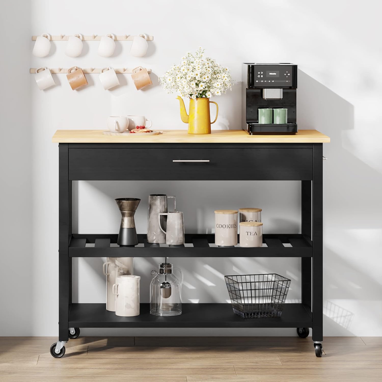Shintenchi Kitchen Island Cart with Storage,Rolling Kitchen Island Side Table on Wheels with Large Worktop,Storage Cabinet,Towel Rack,Drawers and Open Shelves for Kitchen,Dinning Room,Black