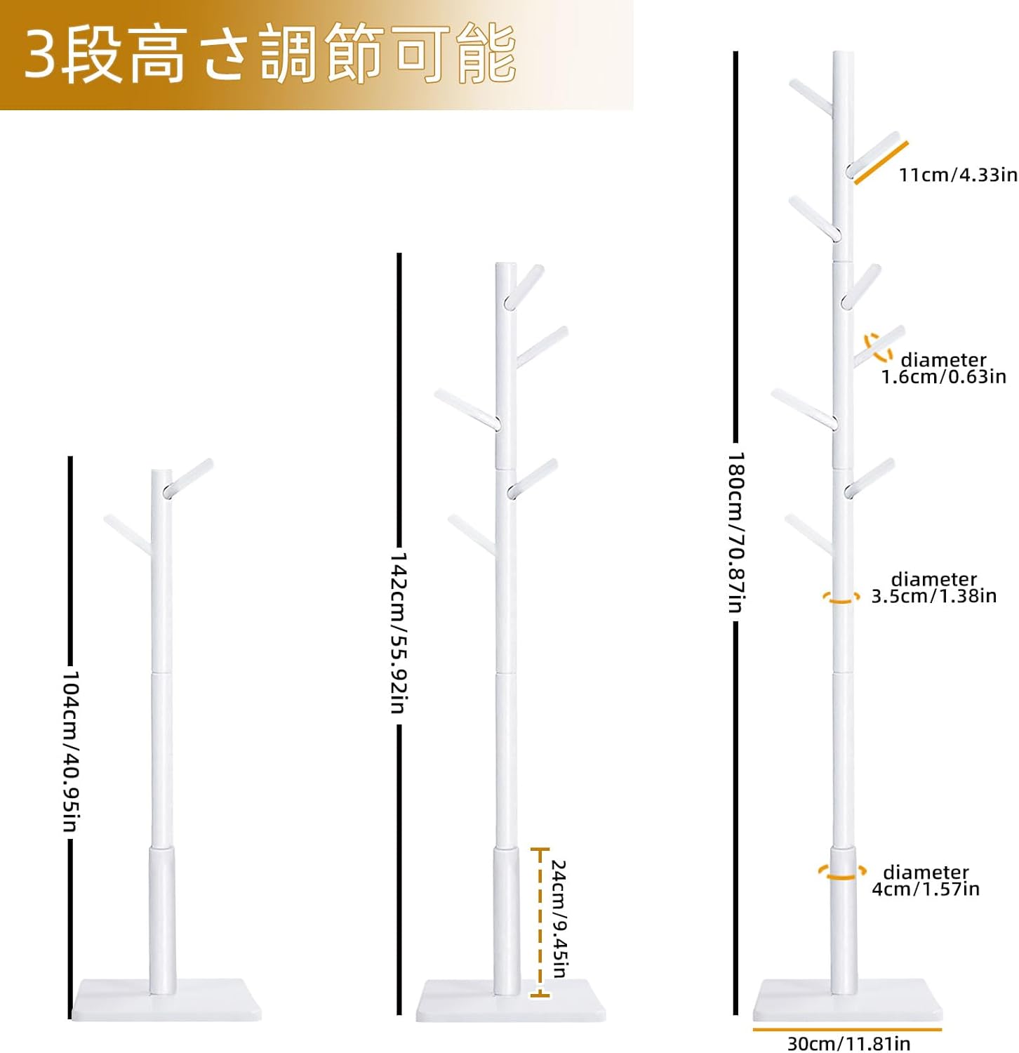 Yawinhe Coat Rack, Sturdy Woode Stand Tree with 8 Hooks, 3 Adjustable Height for Bedroom, Hallway, Entrance, Office, 11.8 x 70.8 inches, White, 1-Pack, Square Base