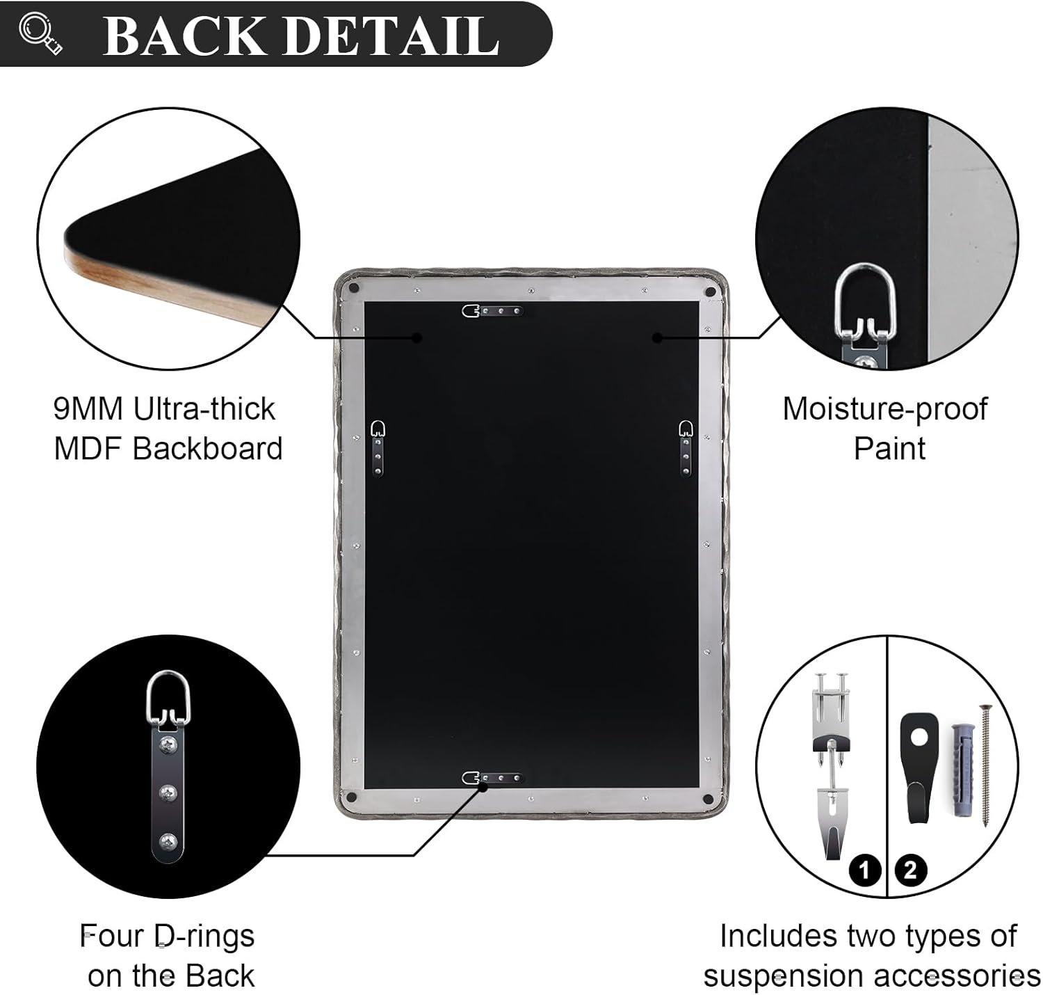 - Thoughtful Packaging & Service: Four pre-installed D-rings on the backboard and included suspension accessories allow you to hang this farmhouse bathroom wall-mounted mirror vertically or horizontally. Carefully designed packaging ensures that this precious artwork is handed over to you in perfect condition. With over 20 years of experience in high-end silver metal frame bathroom mirror manufacturing, Our mirror offers a one-year warranty to guarantee your peace of mind.