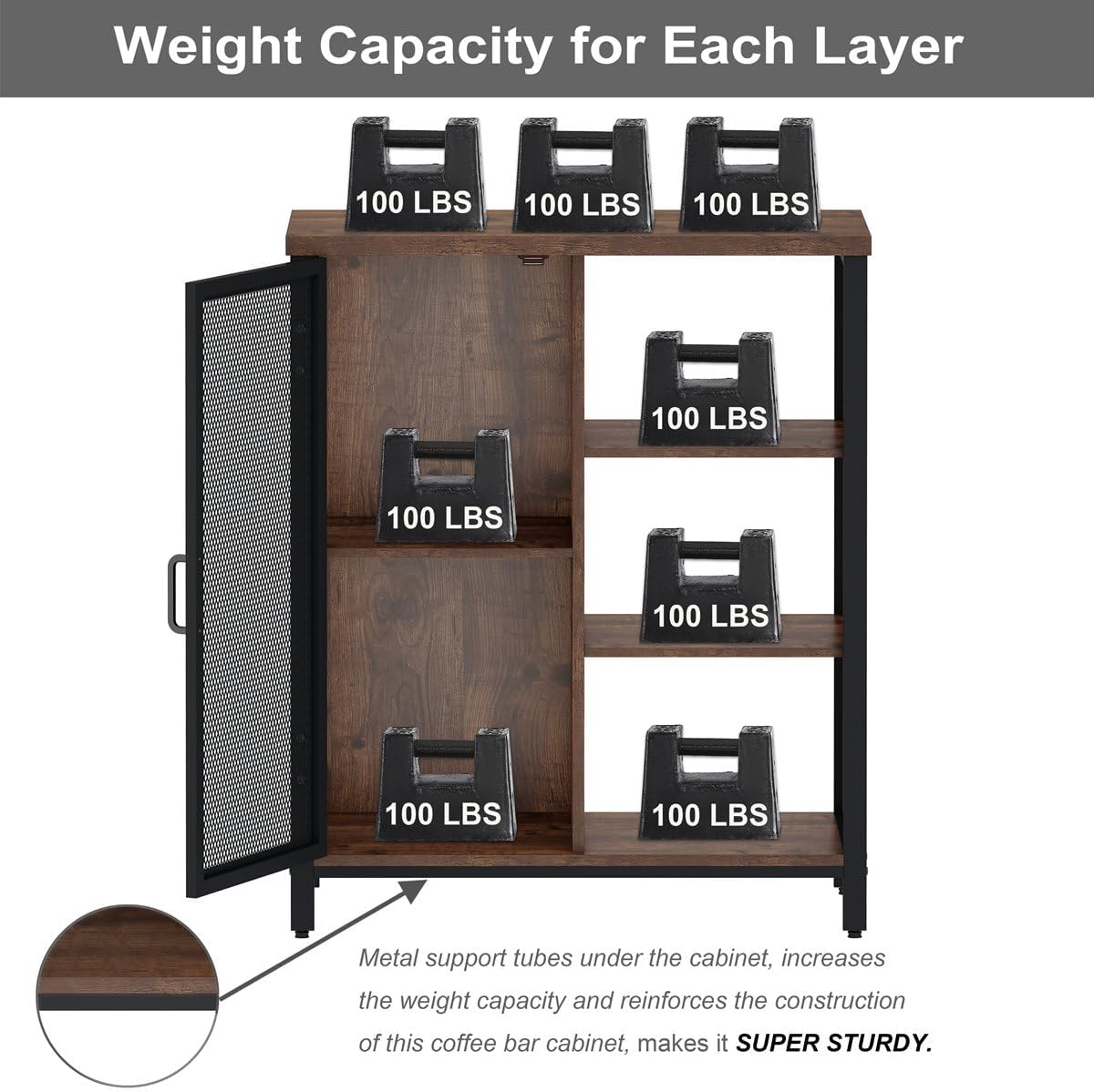 - Not Wobbles: Thanks to heavy duty metal frame and support tube under bottom shelf, the bar cabinet stands quit stable. We also provide anti-tip device, you can mount this bar cart to the wall to avoid unexpected tipping. 4pcs pre-assembled plastic pads avoids your wood floor from scratching.