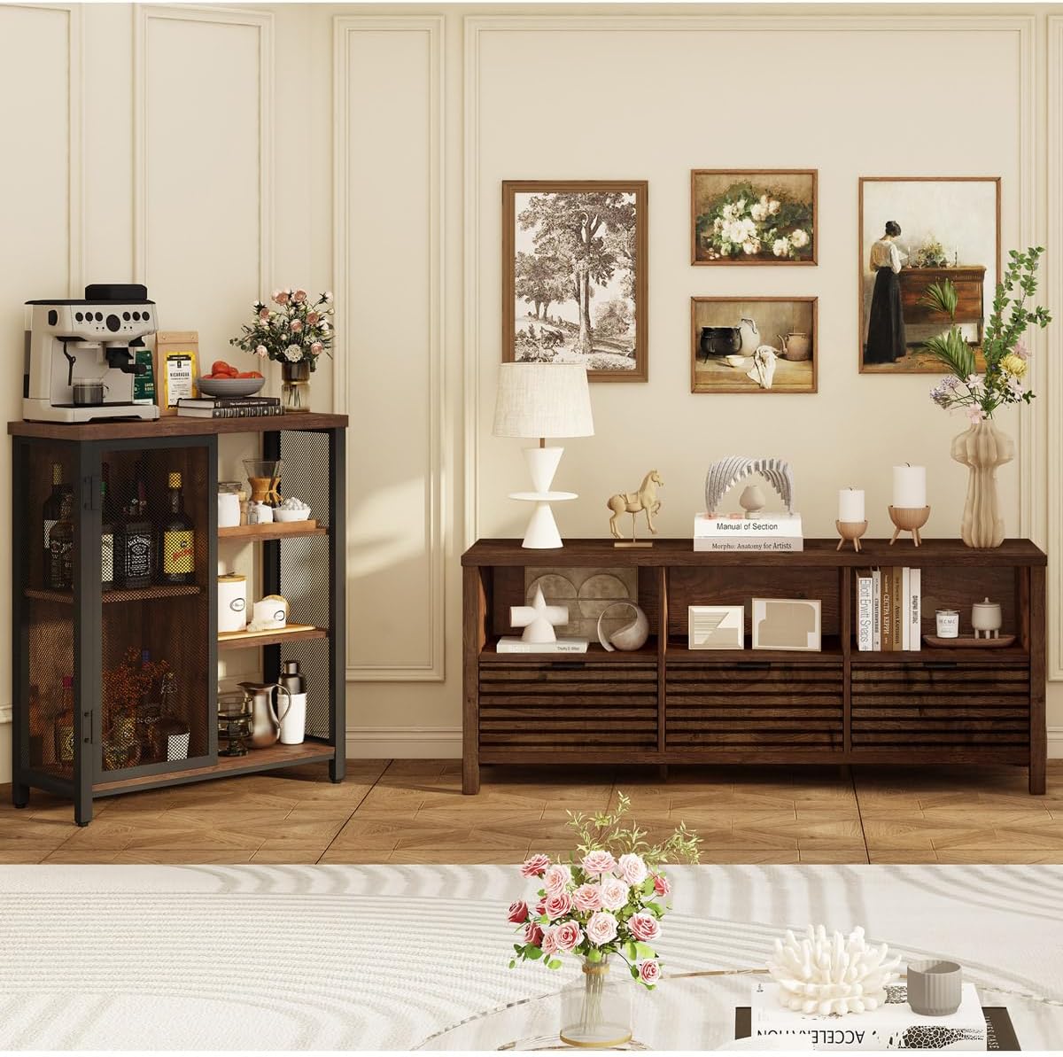 - 36" Height Versatile and Practical Storage Cabinet: There are endless possibilities with this coffee bar cabinet to maximize your space. A 29 inch wide spacious cabinet top offers a perfect place to set up coffee maker and cups, while 3 lower adjustable display shelves offer plenty of storage space for your living room, kitchen, entryway or dining room essentials to meet the needs of storage items of different sizes.