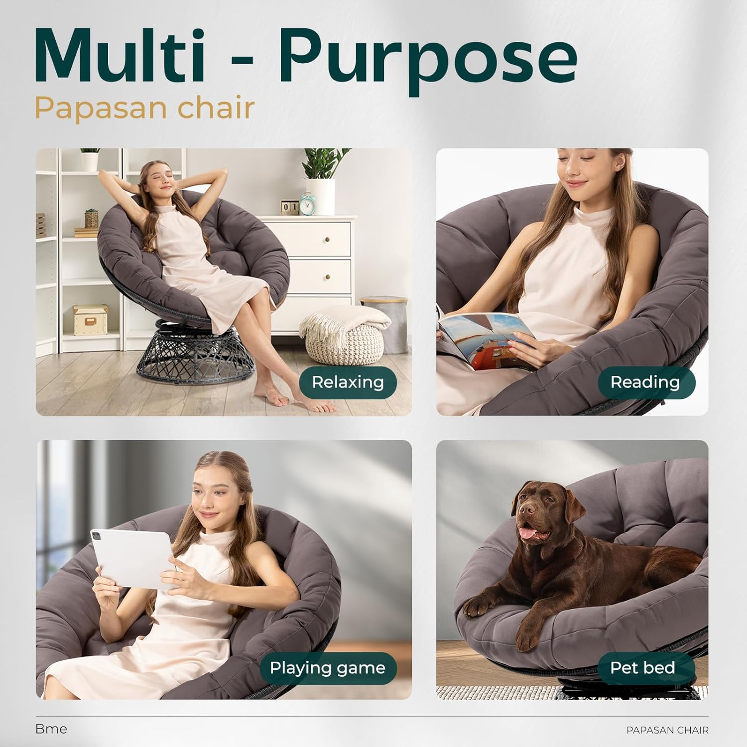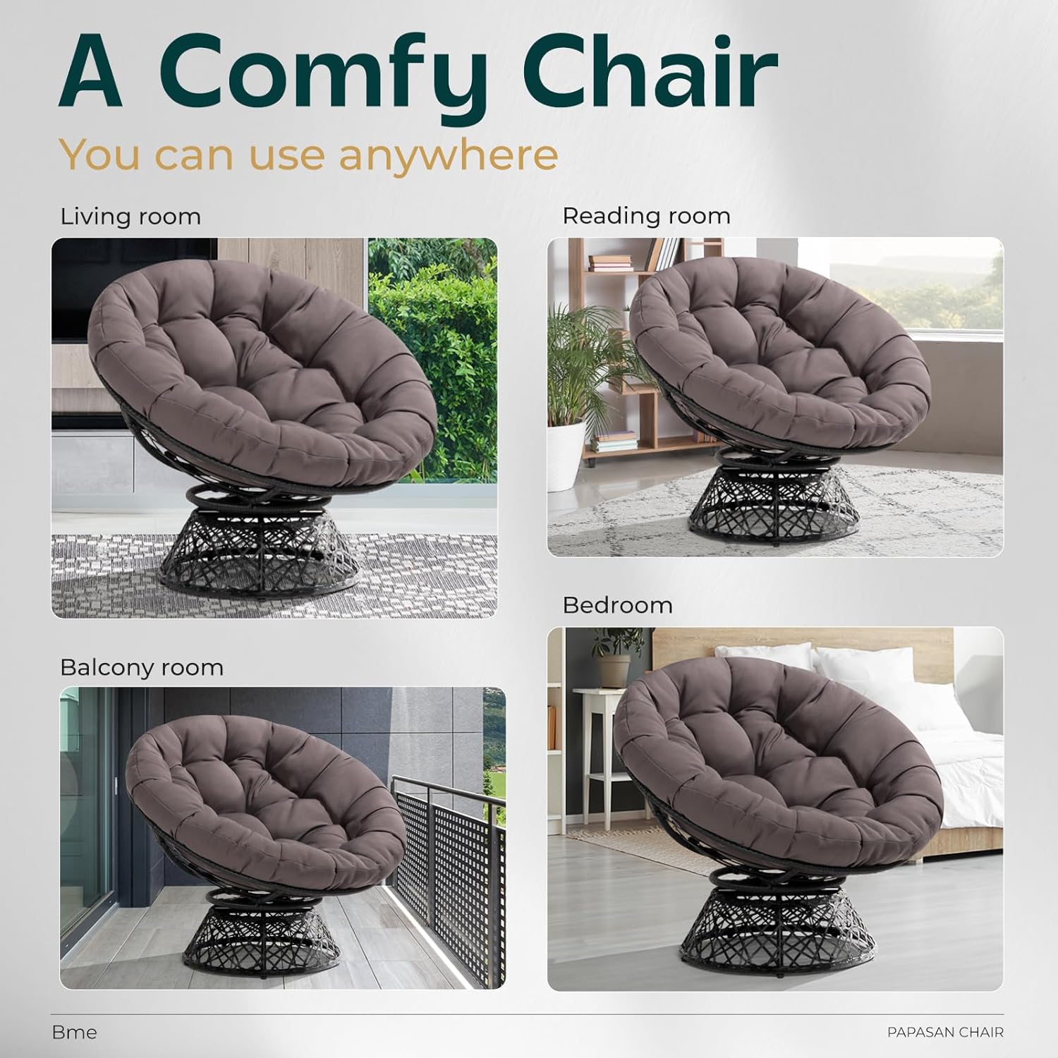 Bme 40" Ergonomic Wicker Papasan Chair with Soft Thick Density Fabric Cushion, High Capacity Steel Frame, 360 Degree Swivel for Living, Bedroom, Reading Room, Lounge, Smoky Quartz - Black Base