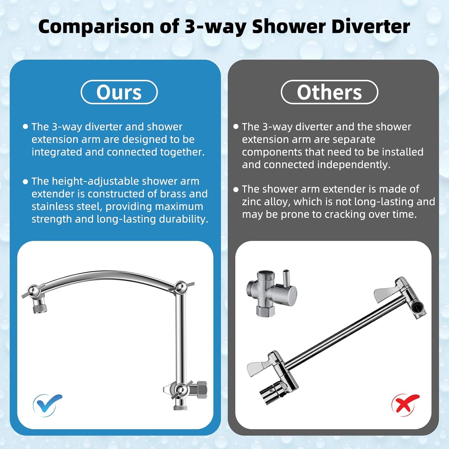 - [Upgraded 3-Way Diverter Valve] Experience hassle-free installation with this shower head combo, requiring no tools or plumbers. The 3-way diverter offers the flexibility to use either a shower head or rainfall shower head alone, or both simultaneously. Our diverter and shower extension arm are designed to be connected without leaking and shaking, while an ordinary 3-way diverter is separated from the extension arm, and it needs to be installed and connected, which will lead to a leak and shake
