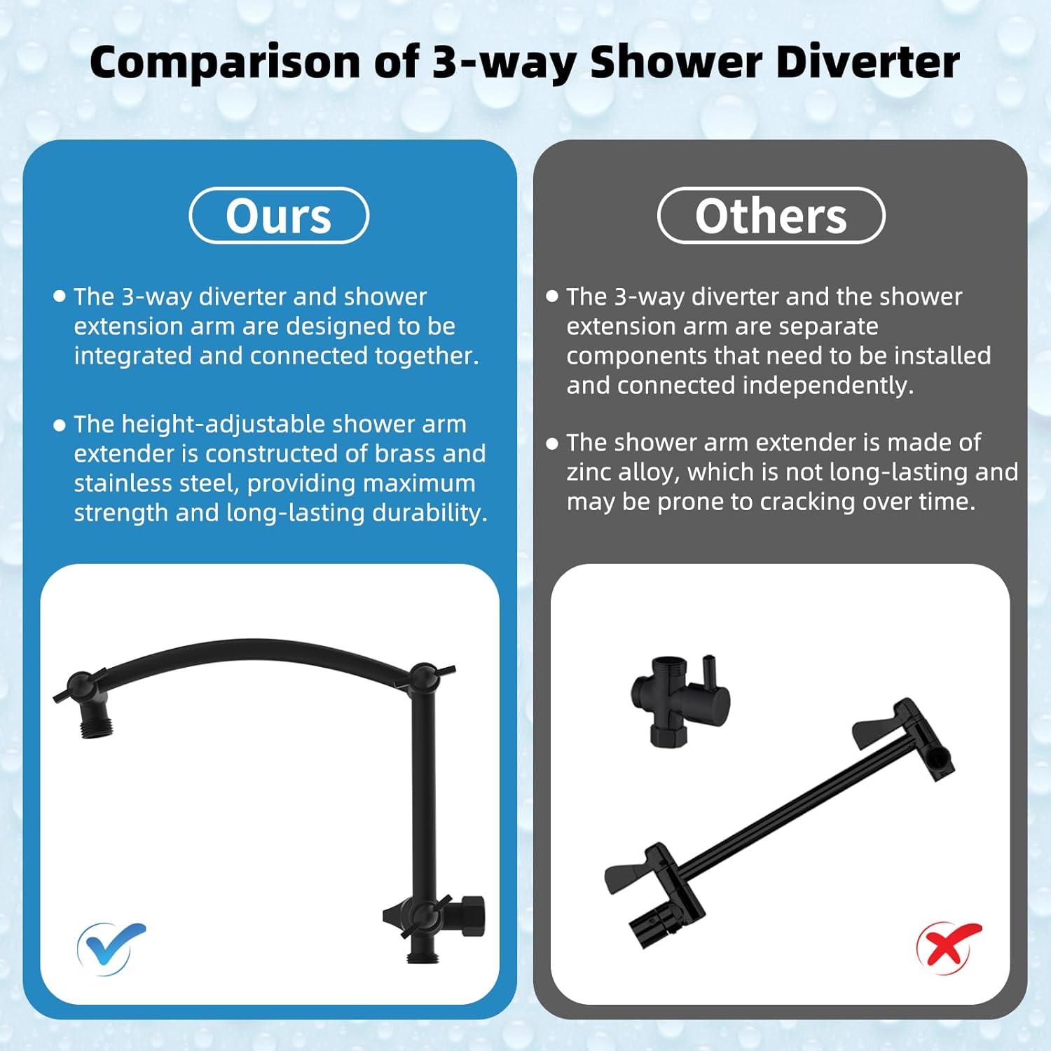 - 16'' Upgraded Shower Extension Arm: Height & angle adjustable arc-shaped design enhances its bearing capacity, high rise your shower head to achieve vertical water. Compared with the regular shower arm extender, the Hibbent shower arm extension can raise the shower head higher or lower and keep the shower head in a horizontal position all the way. The shower head is always vertical in your large size and will not hit the shower arm, instead of sloping water like an ordinary straight shower arm