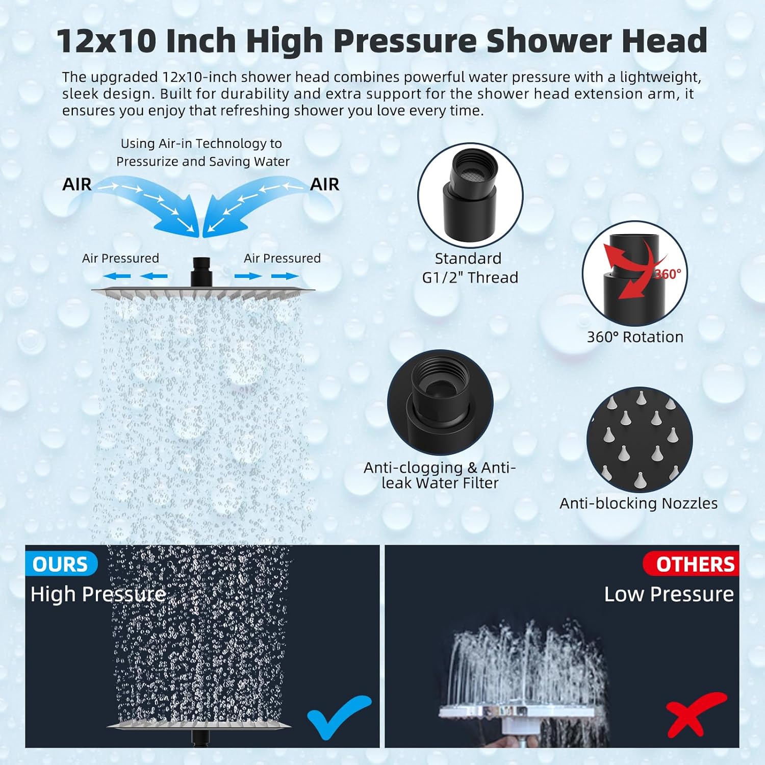 - 12x10'' Rainfall Shower Head: The large rainfall shower head is made of certified SUS 304 stainless steel, ensuring resistance to rust and long-lasting durability. Its elegant ultra-thin design, combined with air-in technology, produces a luxurious rain spray through 154 splash jets. The upgraded 12x10'' shower head not only delivers increased water pressure but is also lightweight, offering better support for the shower arm extension while providing an equally rejuvenating shower experience
