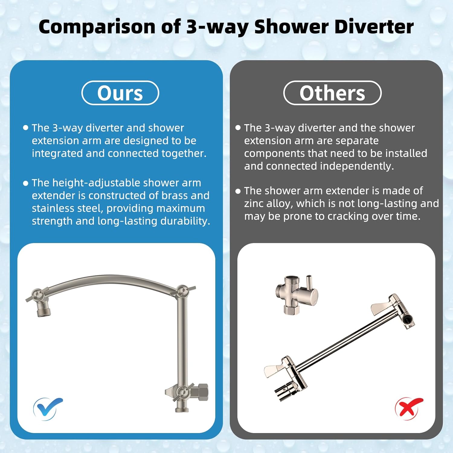 - Upgraded 3-Way Diverter Valve: Enjoy a hassle-free shower setup with this all-in-one shower head combo—no tools or plumbers needed! The 3-way diverter gives you the ultimate flexibility to switch between a shower head, and a luxurious rainfall shower head, or enjoy both simultaneously. Crafted for a leak-free and stable connection, our diverter and extension arm are designed to fit seamlessly without leaking and shaking. Unlike ordinary 3-way diverters that require separate installation and often cause leaks or wobbling, ours stays secure and leak-proof, making your shower experience smoother and more enjoyable