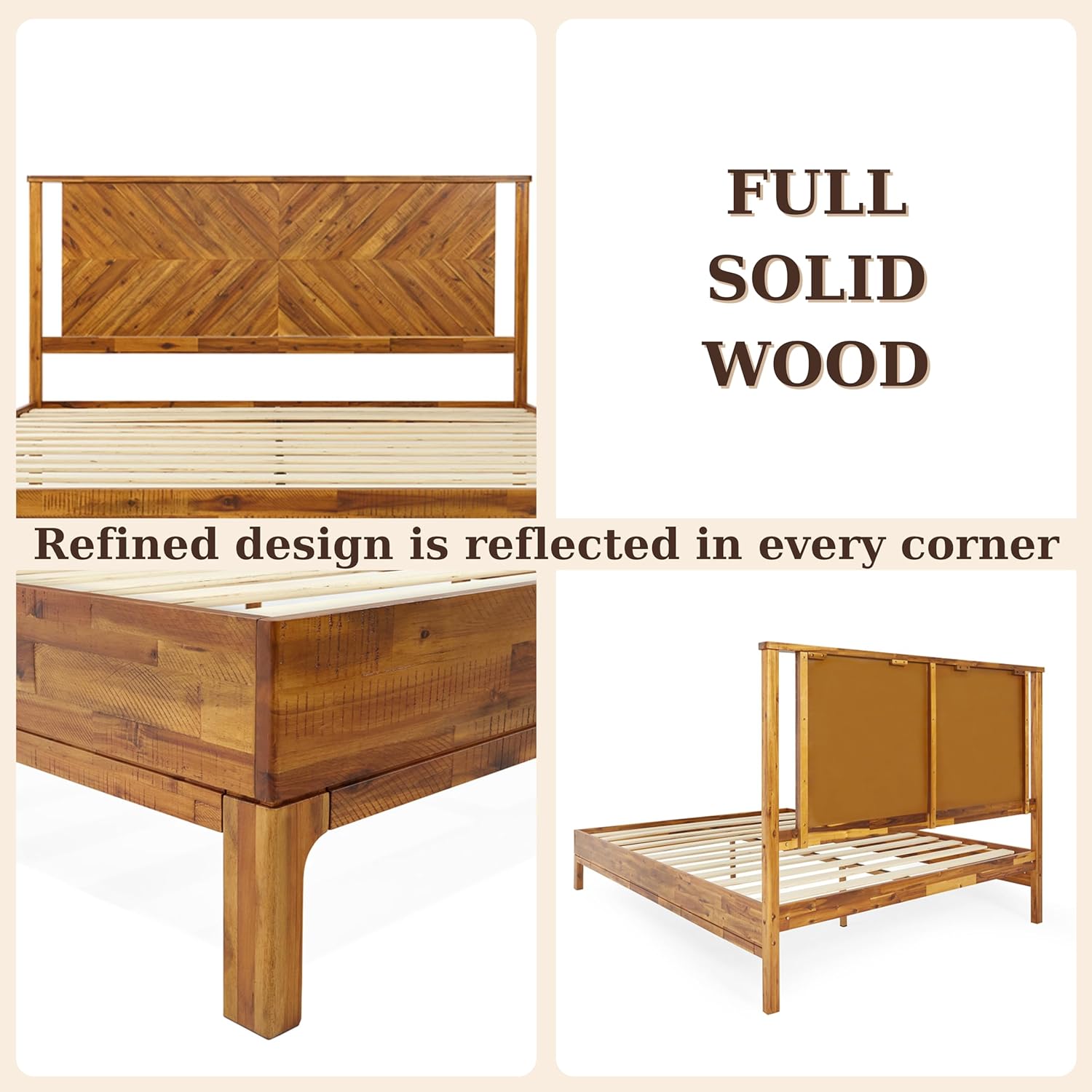 Bme Vivian 14 Inch Deluxe Bed Frame with Headboard, Rustic & Scandinavian Style with Solid Acacia Wood, No Box Spring Needed, 12 Strong Wood Slat Support, Easy Assembly, Queen, Rustic Golden Brown