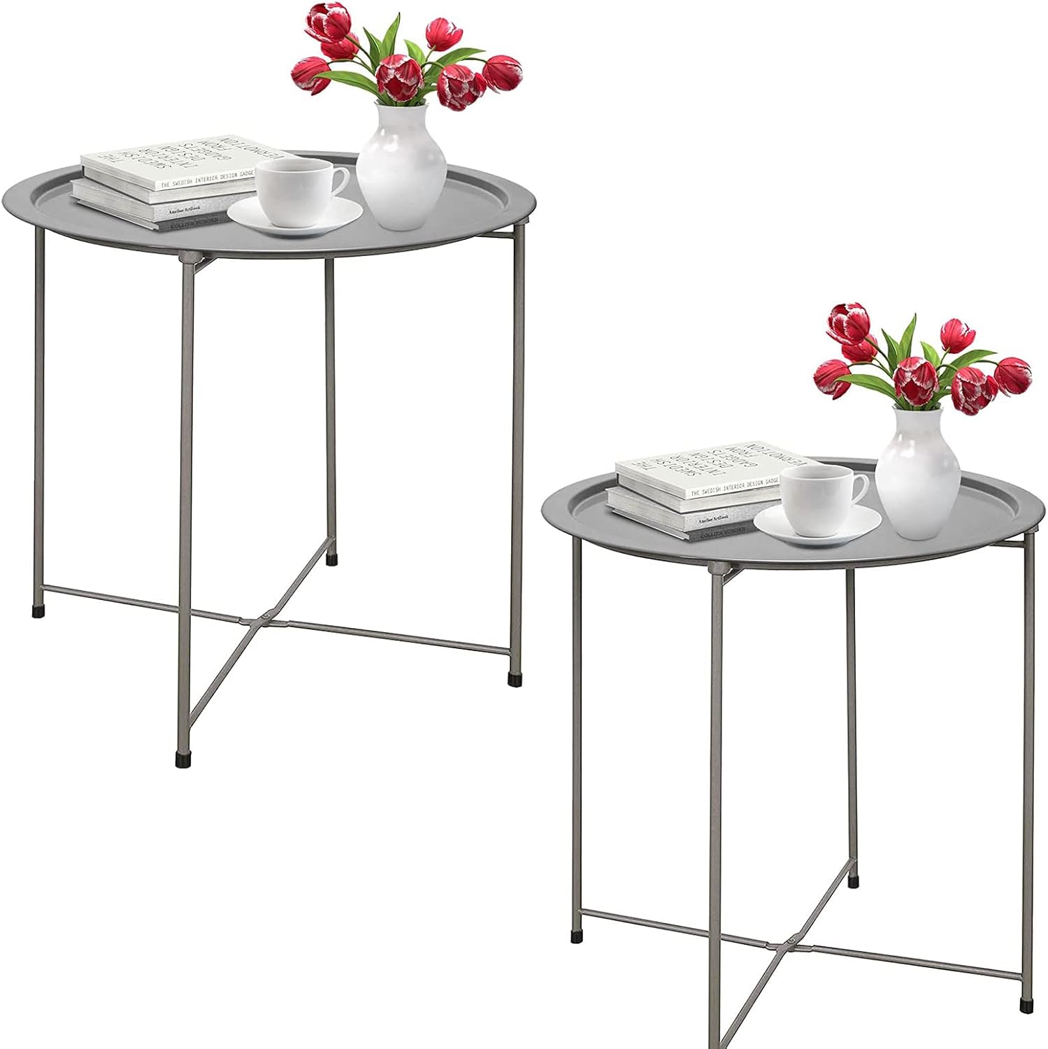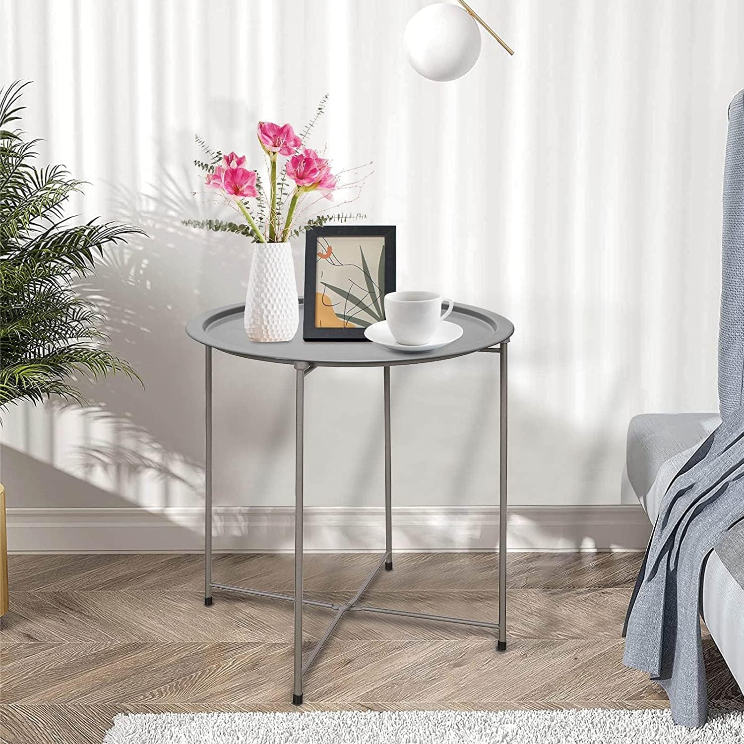 Garden 4 you Folding Tray Metal Side Table 2PC Grey Round End Table Cyan Sofa Small Accent Fold-able Table, Round End Table Tray, Next to Sofa Table, Snack Table for Living Room and Bed Room
