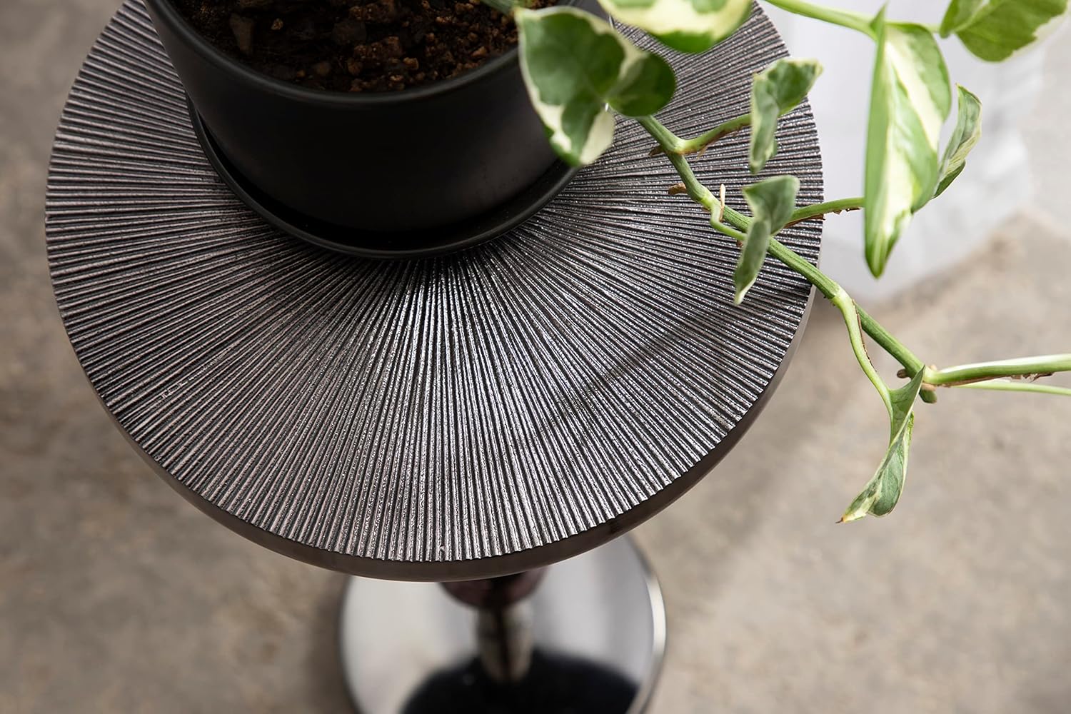 Kate and Laurel Engles Transitional Adjustable-Height Pedestal Drink Table; 10 x 10 x 30; Gray Gunmetal; Vintage Round Indoor Metal Plant Stand with Embossed Sunburst Pattern