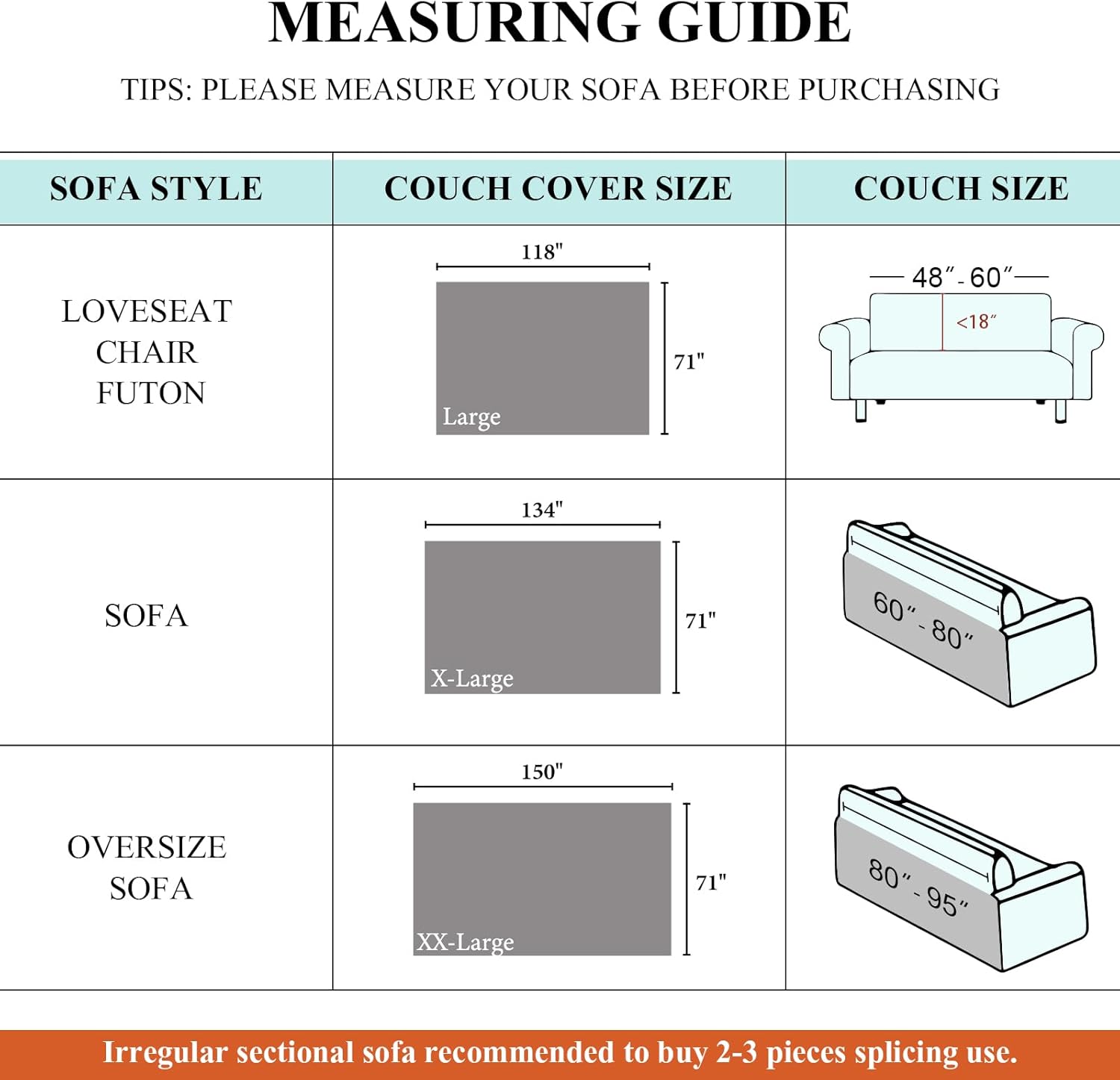 - 【Package Including】71''x134''(1PC)- Pillowcase Not Included, Suitable for 3-4 seat sofa,Suitable for most irregular sofas(It is recommended to buy 2-3 pieces for sectional sofa),Multi-functional blanket,It can also be used as carpets, tablecloths, furniture covers, picnic blankets, etc❋❋Note: We provide pre-purchase guide, please measure the sofa size carefully!