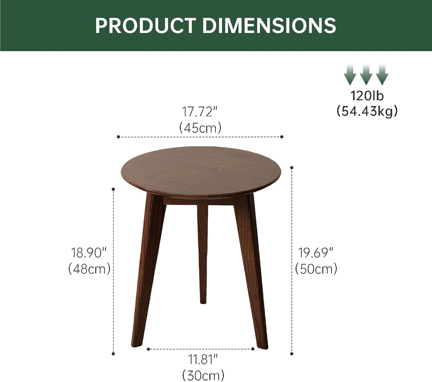 100% Solid Oak Round Side Table, Small Bedside Table for Small Spaces, Living Room End Table with Stable Frame, Modern Nightstand for Bedroom Couch, (Walnut, 17.71" D x 19.68" H)
