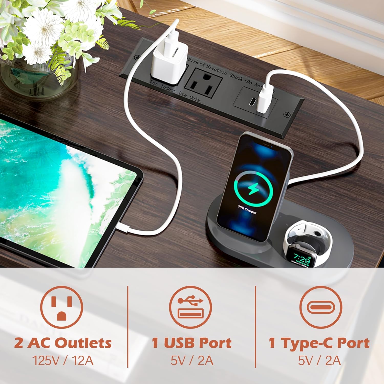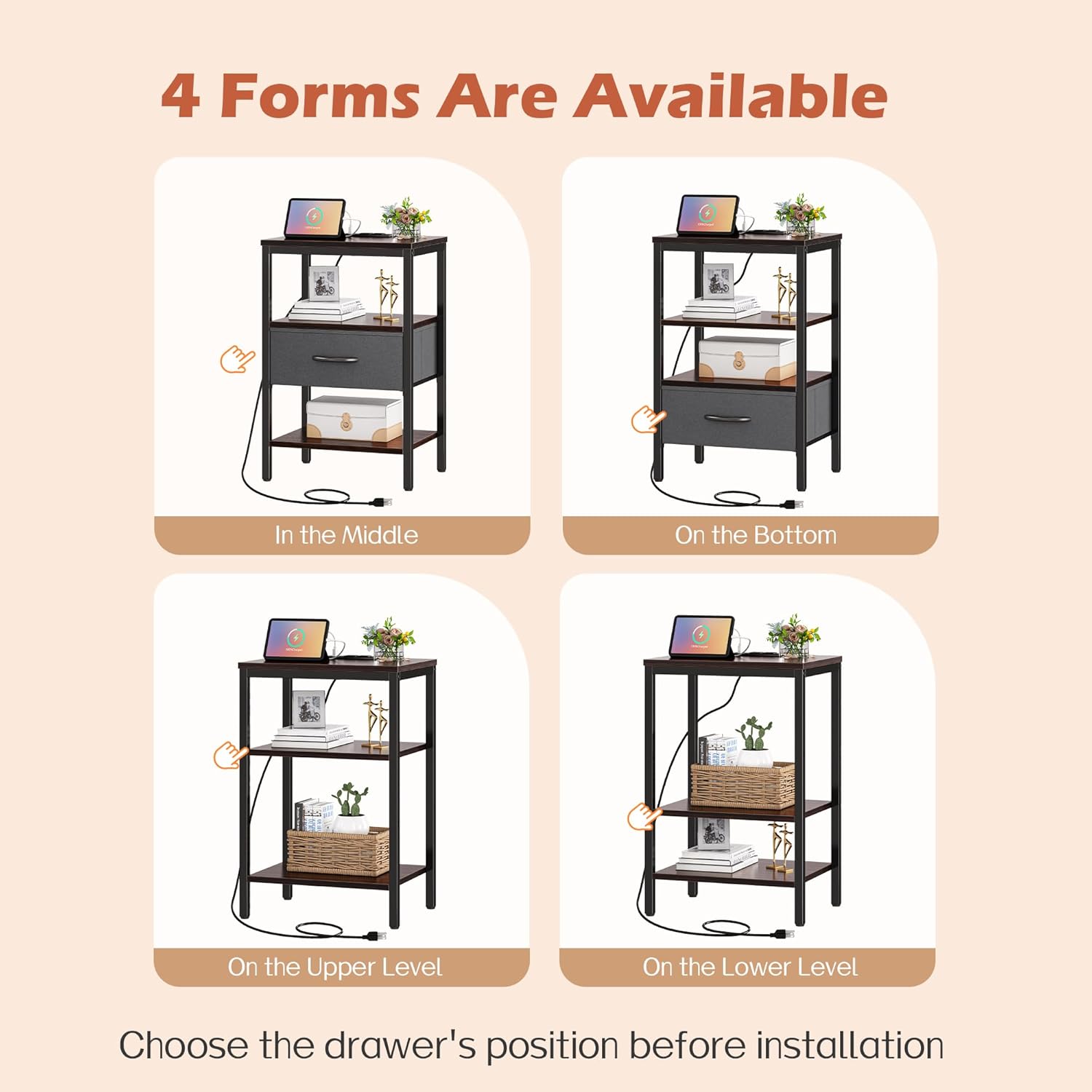 - 【Night Stand with Charger Station】: 1 USB port, 2 outlets and 1 Type-C port are on the nightstand for bedrooms. Imagine plugging in your lamp, phone or watch before sleep, power is just within your reach, then be happy to greet the morning with fully charged devices. Plus: Contain patent pending drawer slide