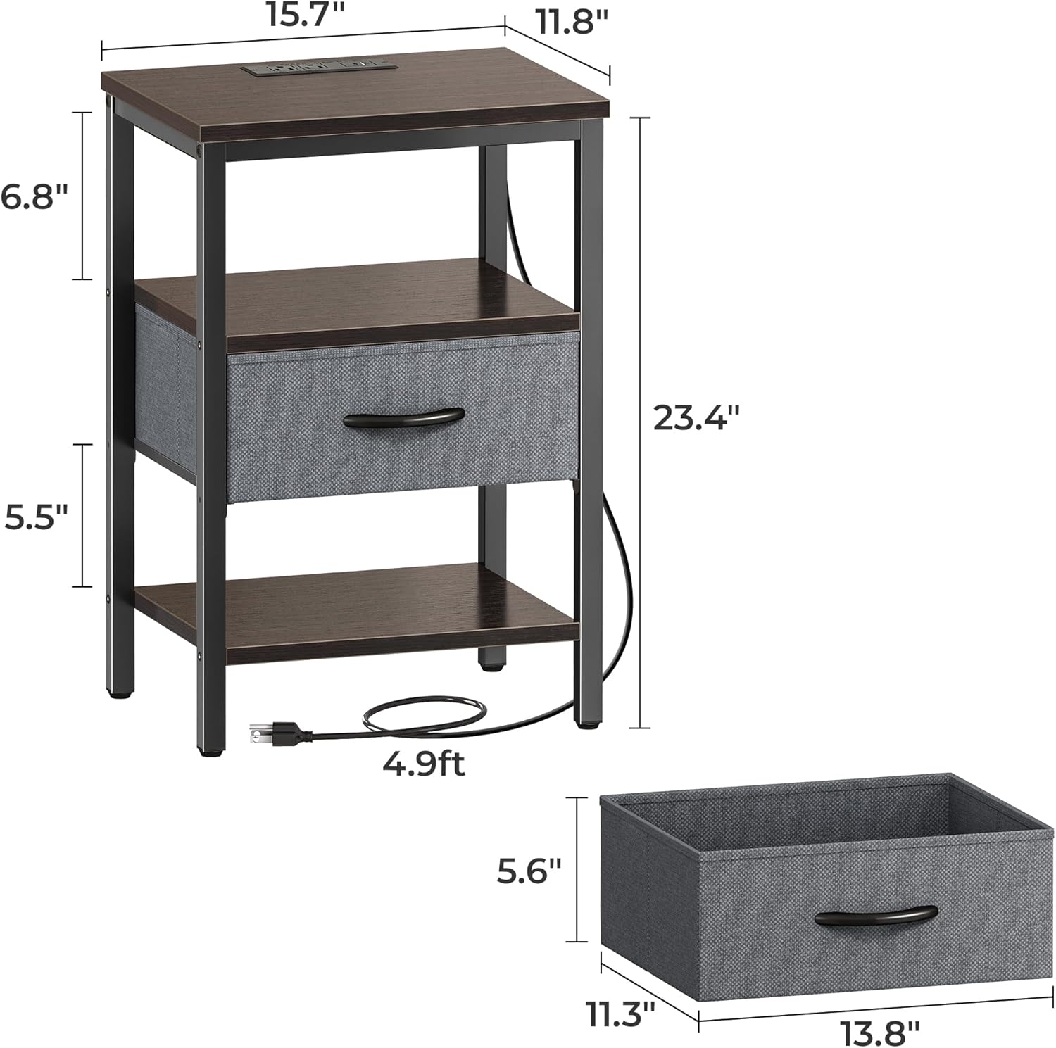 - 【Go for a Long Time】: Walnut shelves blend black metal frame and gray fabric drawer, making it a timeless classic. Sturdy P2 particle board, robust metal frame, and durable fabric drawer, all these work excellently to give this side table with charging station strong support