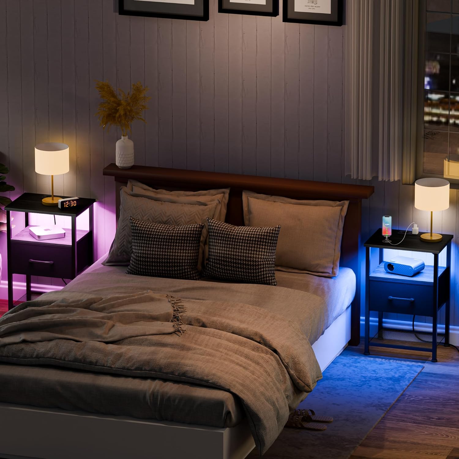 Nightstands Set of 2 with Charging Station and Drawer, End Table Bedside Table with 20 Colors LED Light Strip and 2 Layers Shelf for Bedroom Living Room Sofa Couch (Black)