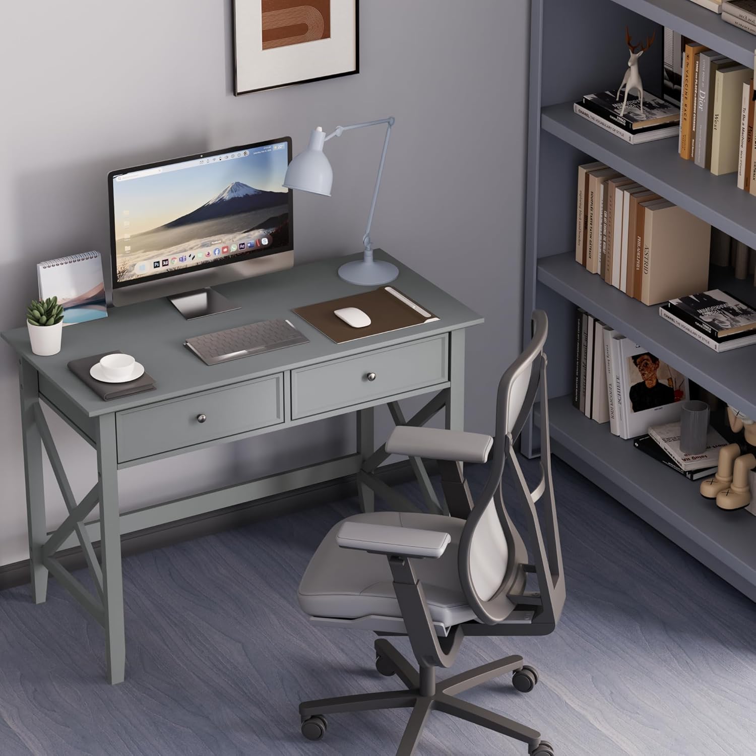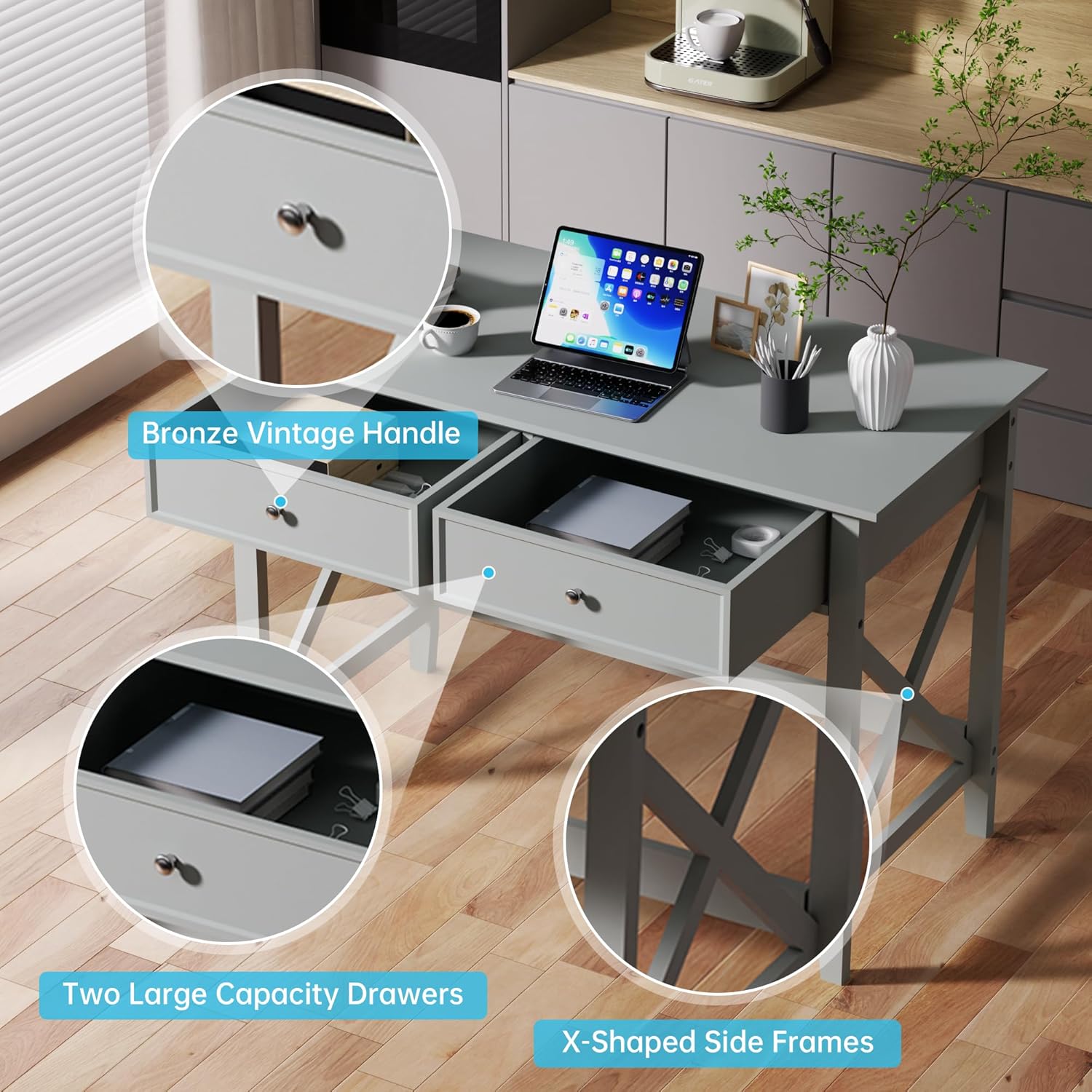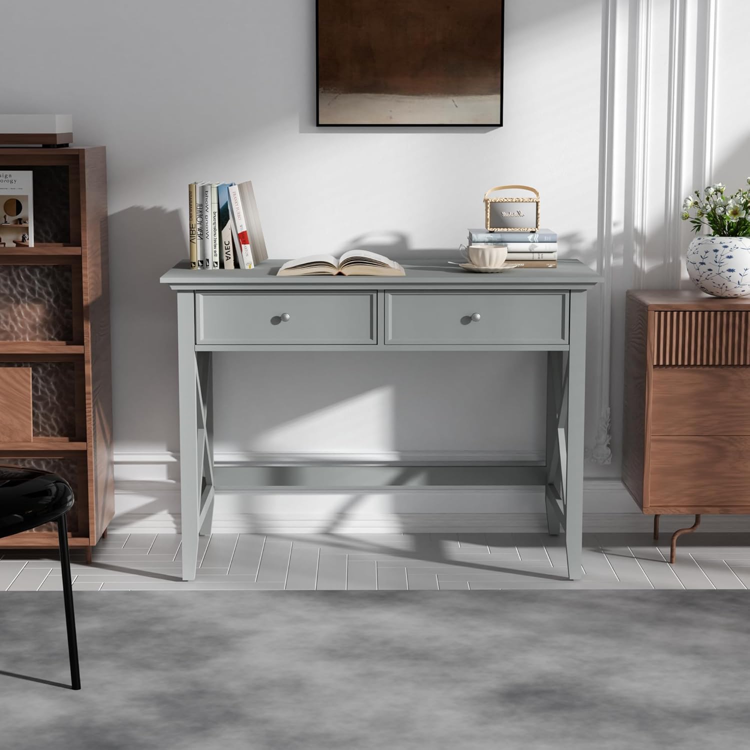 Computer Desk with 2 Drawers, Elegant Home Office Writing Study Desk with Storage, Modern Simple Vanity Desk Console Table for Living Room, Grey