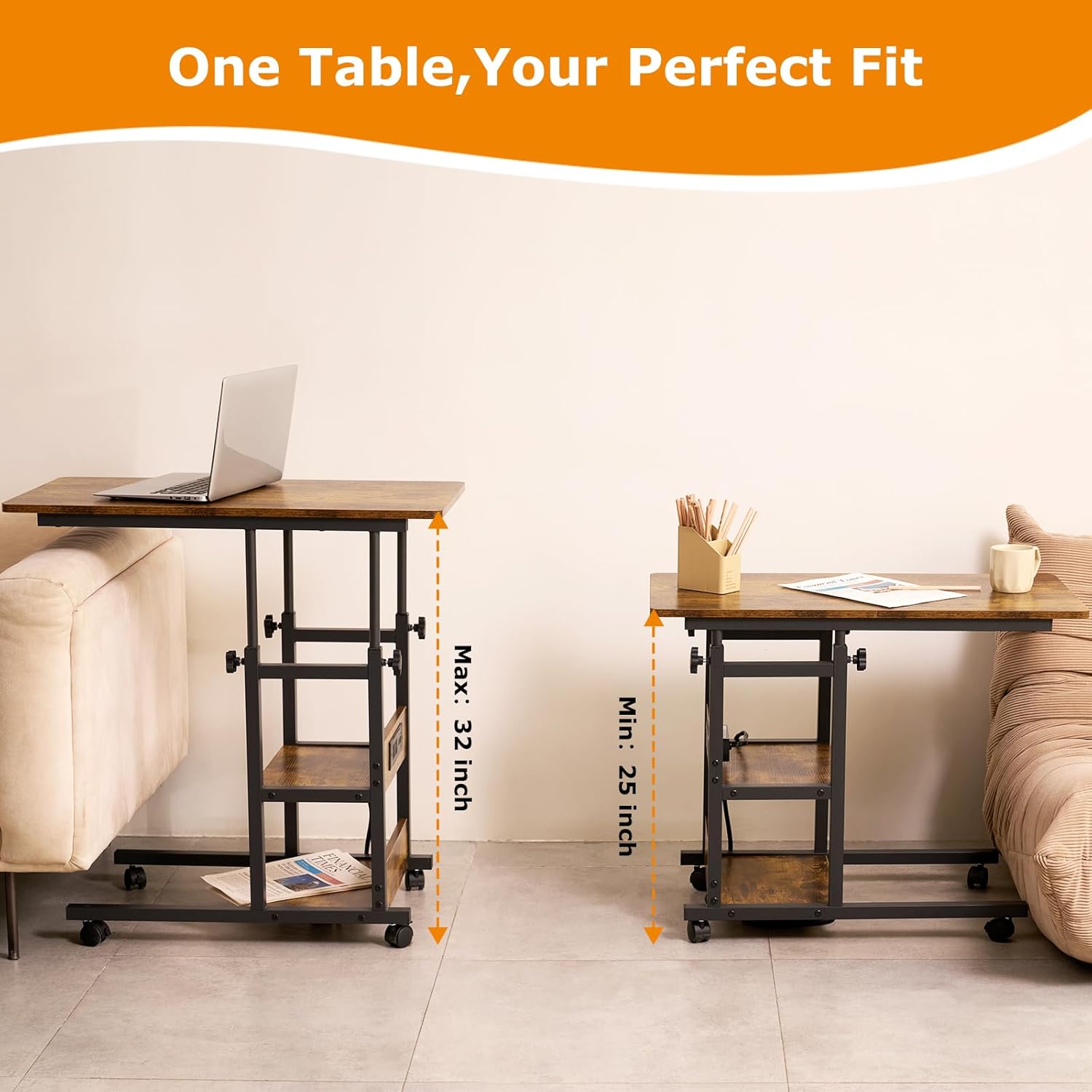 C Shaped End Table Height Adjustable - Couch Side Table with Charging Station, TV Tray with Wheels Slide Under Sofa for Small Spaces, Living Room Bedroom, Rustic Brown