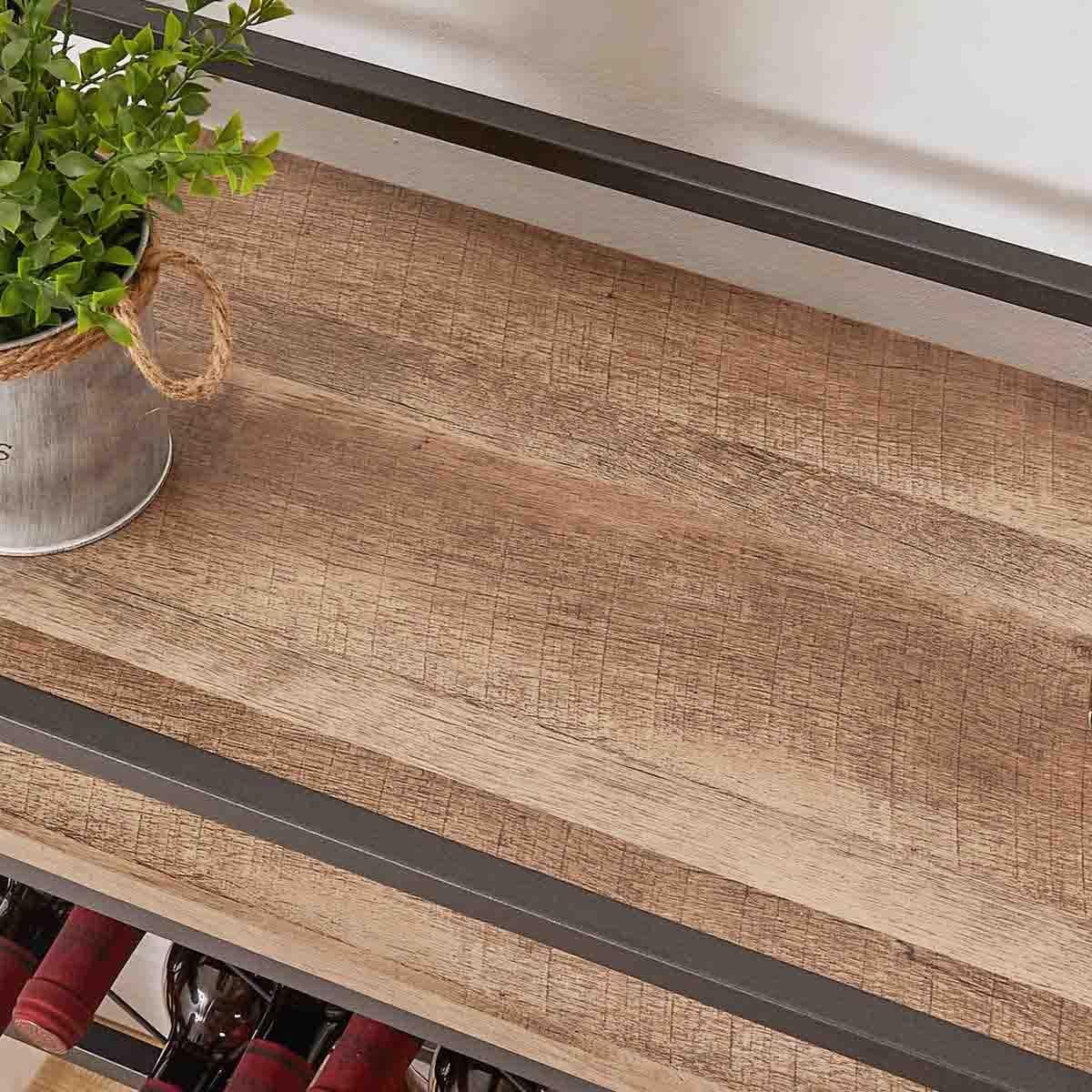 - [Sturdy & Weight Capacity]: Thanks to the material and well-structured design, heavier wood provides a sturdier base, and metal rails wrap around each shelf to stop bottles of liquor or wine from sliding off while rolling. Additionally, there are 2 support tubes under the top and bottom shelves that significantly increase the weight capacity. Each shelf can easily hold up to 150 lbs respectively.