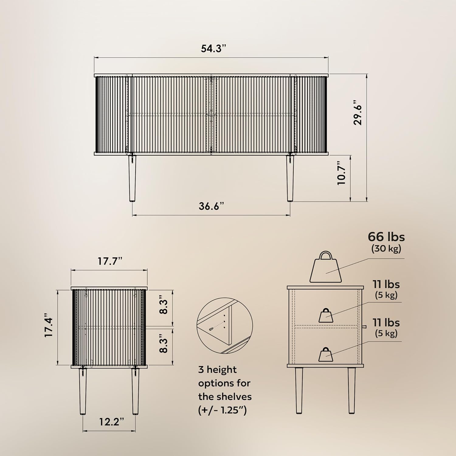 - ENJOY EFFORTLESS STORAGE as you can choose between 3 set heights for the adjustable shelf to maximize the use of the six storage spaces hidden behind the sliding doors. Fluted oak dining room buffet cabinet (width 54.3 ‘’ x height 29.5’’ x depth 17.7’’) offers easy access to most frequently used tableware and serving utensils.