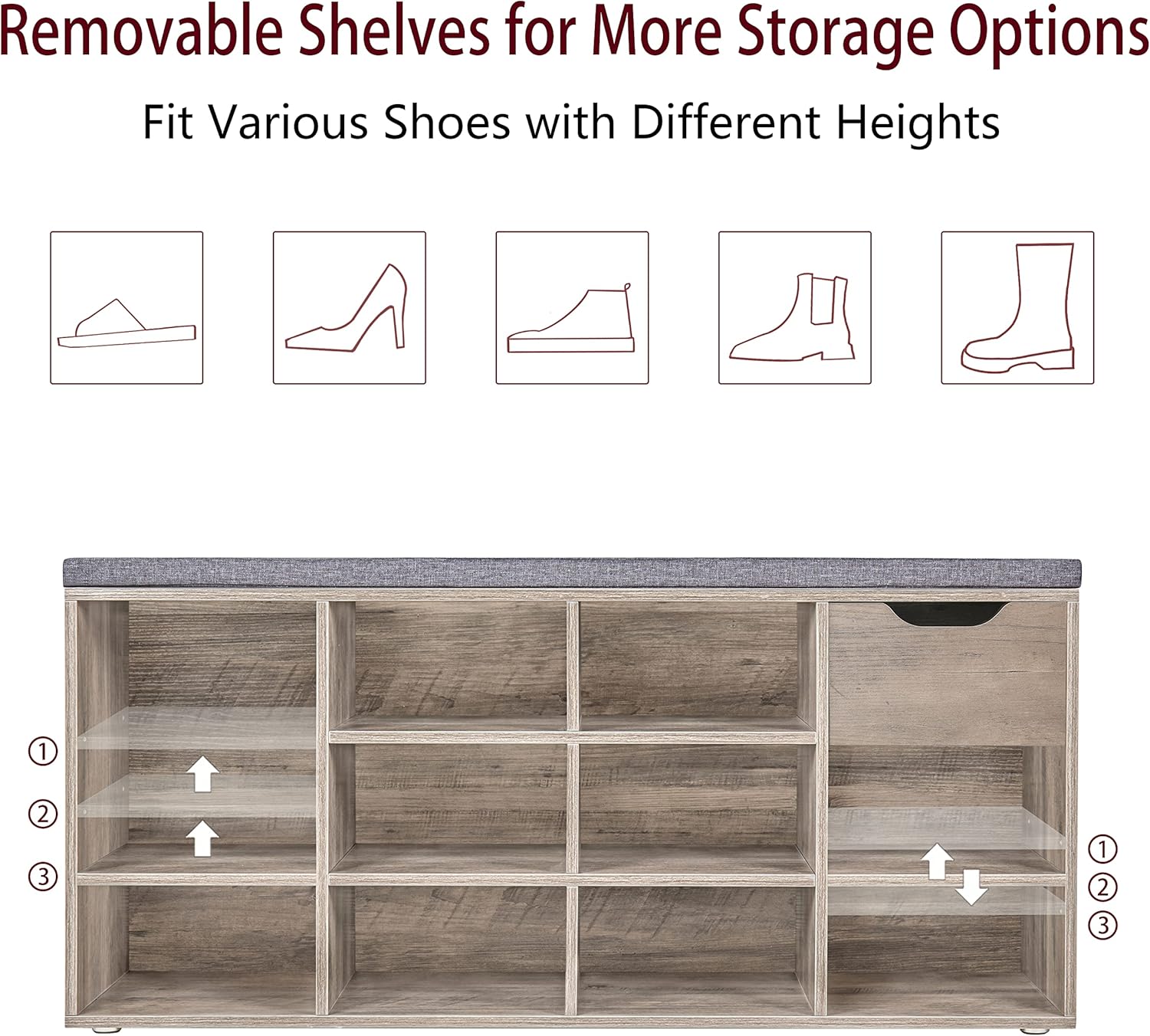 - 【Multi-purpose Shoe Bench】Hide your keys, wallet, gloves, sunglasses, flashlight and dog leash in the small drawer. Everything is easy to reach before going out. 11 cubbies are available for 9-11 pairs of shoes. To be a entryway bench, window seat and bed-end stool for entry porch, front door, living room, bedroom