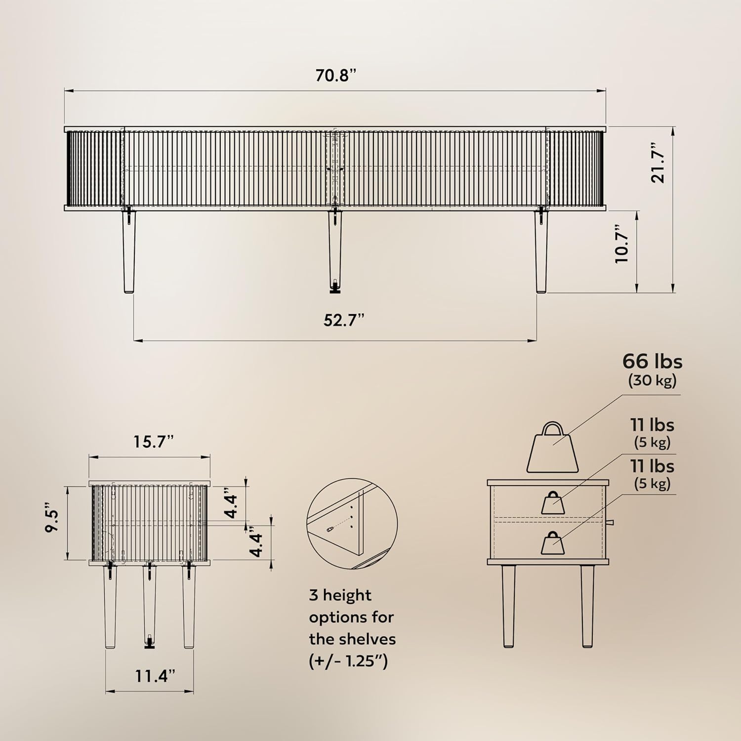 - ENJOY EFFORTLESS STORAGE as you can choose between 3 set heights for the adjustable shelf to maximize the use of the six storage spaces hidden behind the sliding doors. The TV stand cabinet (width 70,9 ‘’ x height 21,7’’ x depth 15.7’’) offers easy access to most frequently used cables, remotes, DVDs, video games and other accessories.