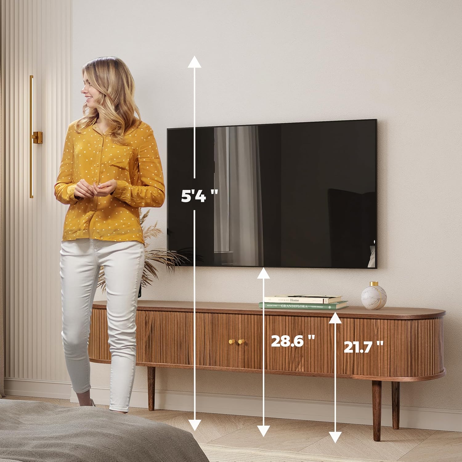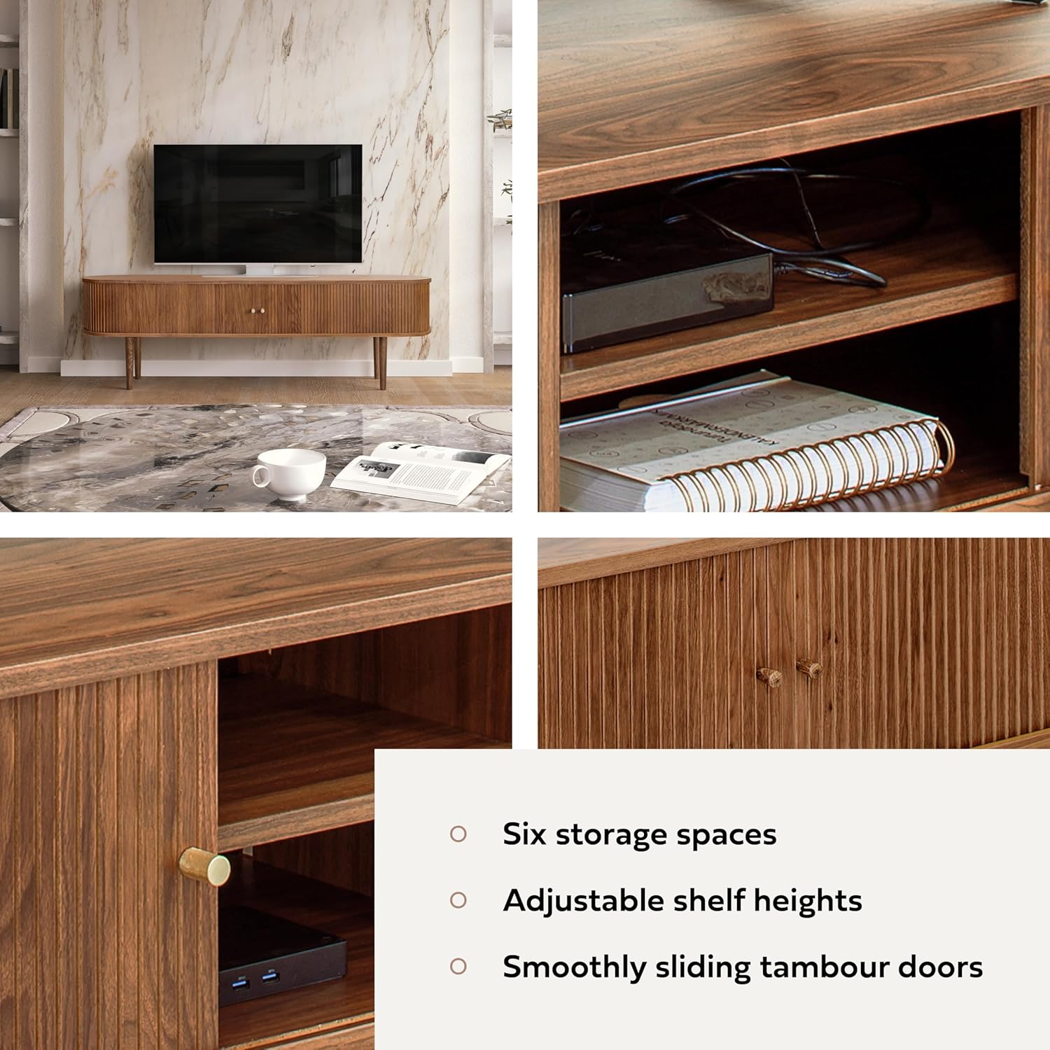 - BRING CHARACTER TO YOUR HOME by using a walnut modern tv stand which curvy corners and smoothly sliding tambour doors makes it a perfect accent cabinet. Aesthetic appeal makes it suitable for both living room tv stand and bedroom tv table. You will receive 2 sets of door knobs - wood & messing.